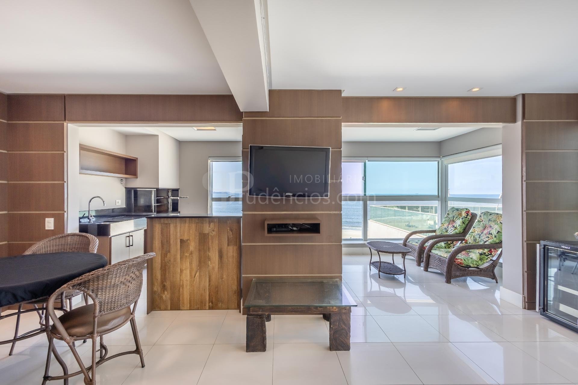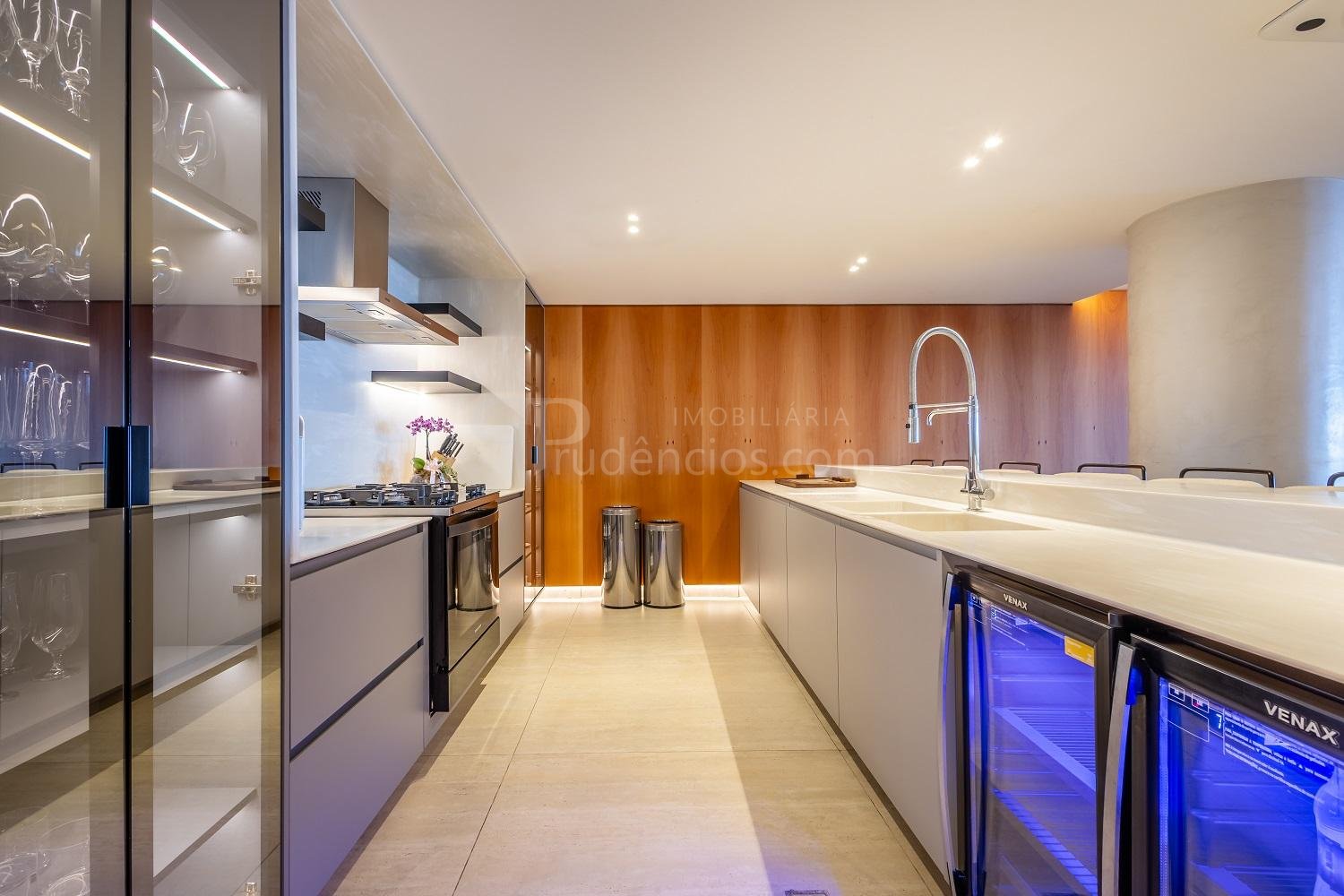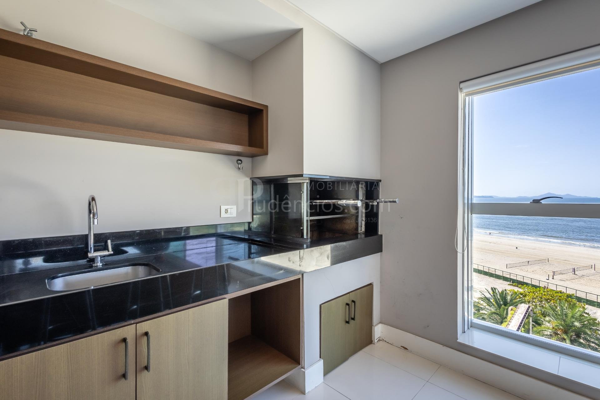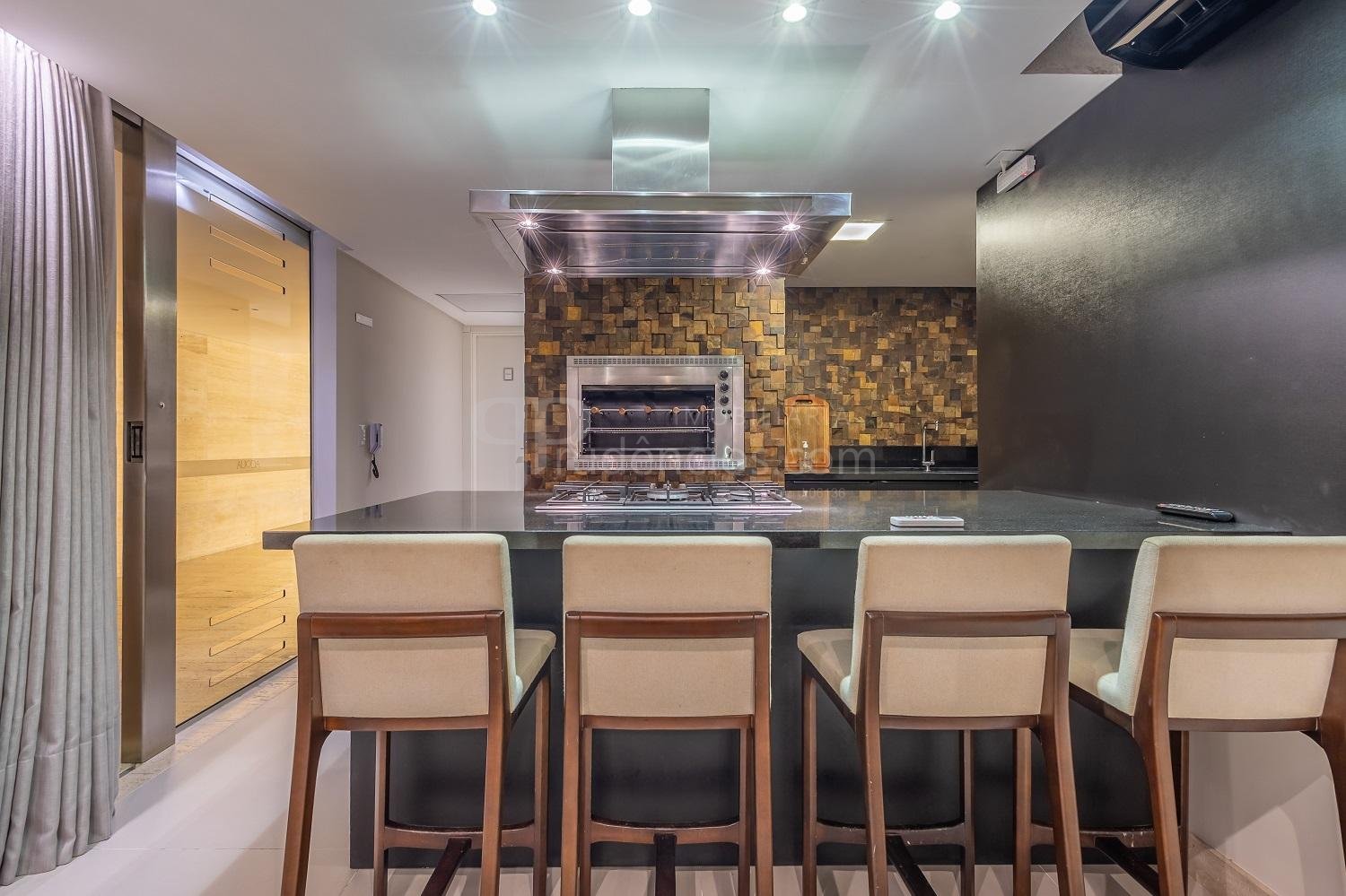 Varanda gourmet com churrasqueira a carvão e integrada a área social, proporcionando uma vista definitiva do mar. A cozinha e ampla e conta com espaço para mesa de café e refeições rápidas. Há ainda área de serviço independente e dependência de empregada.