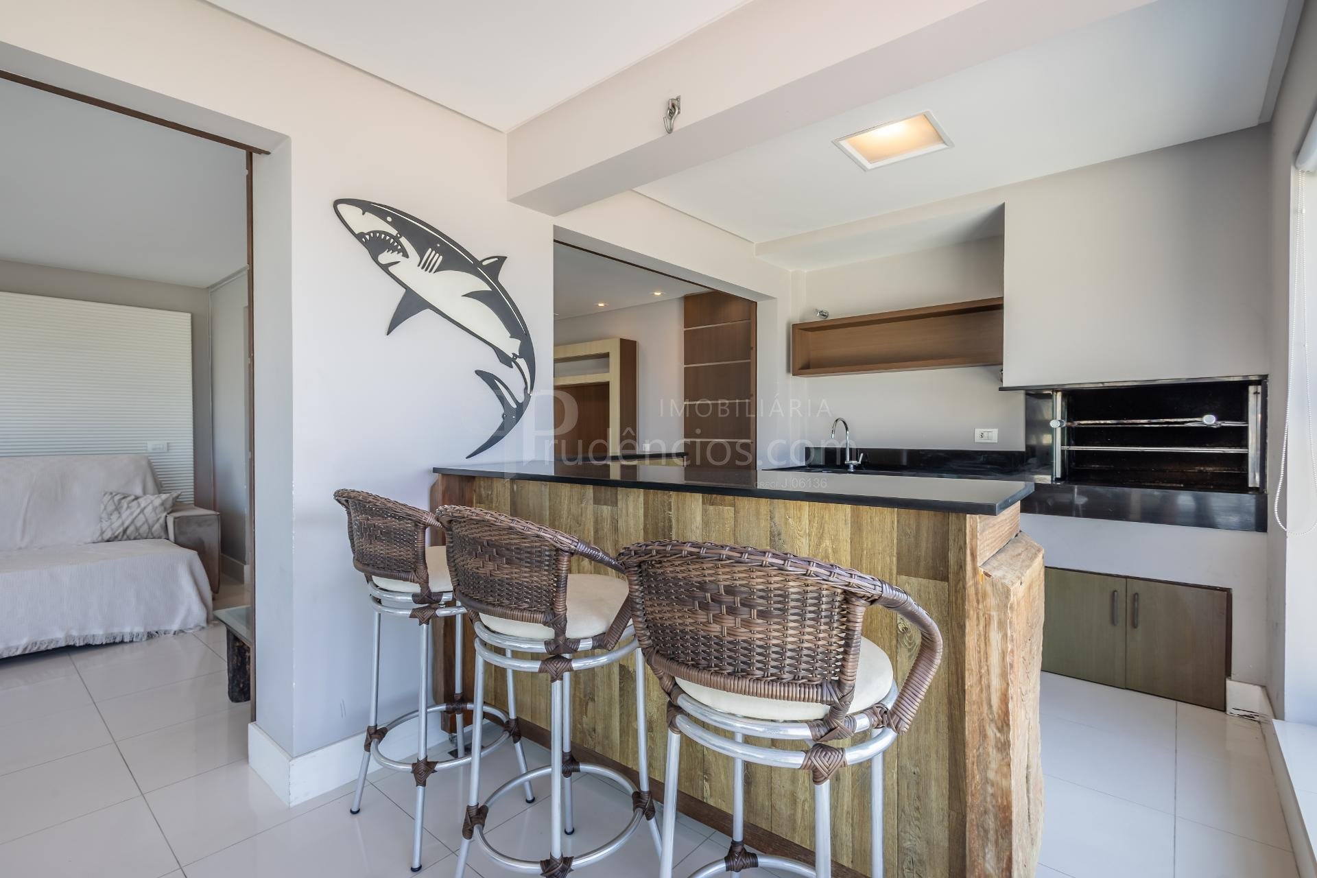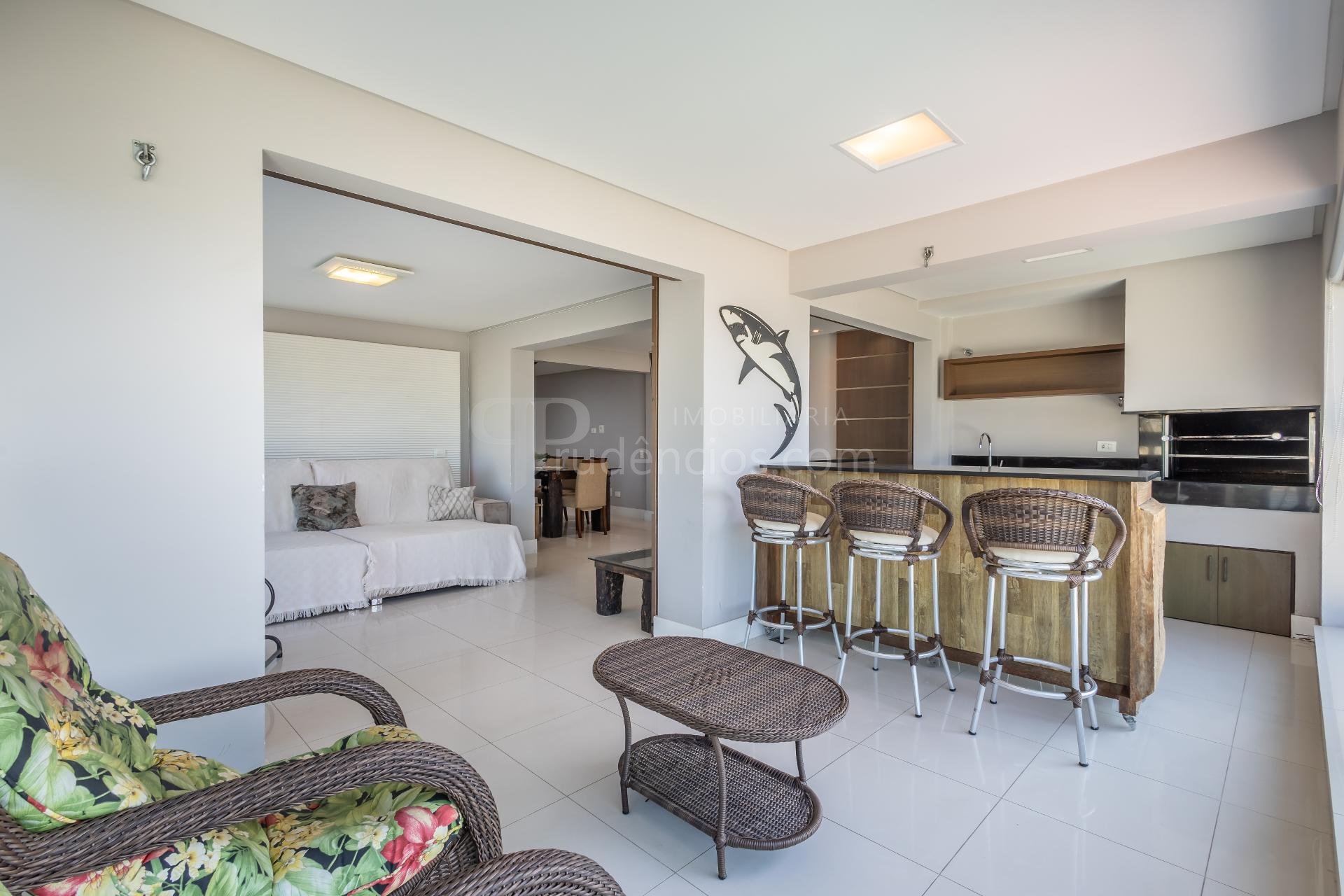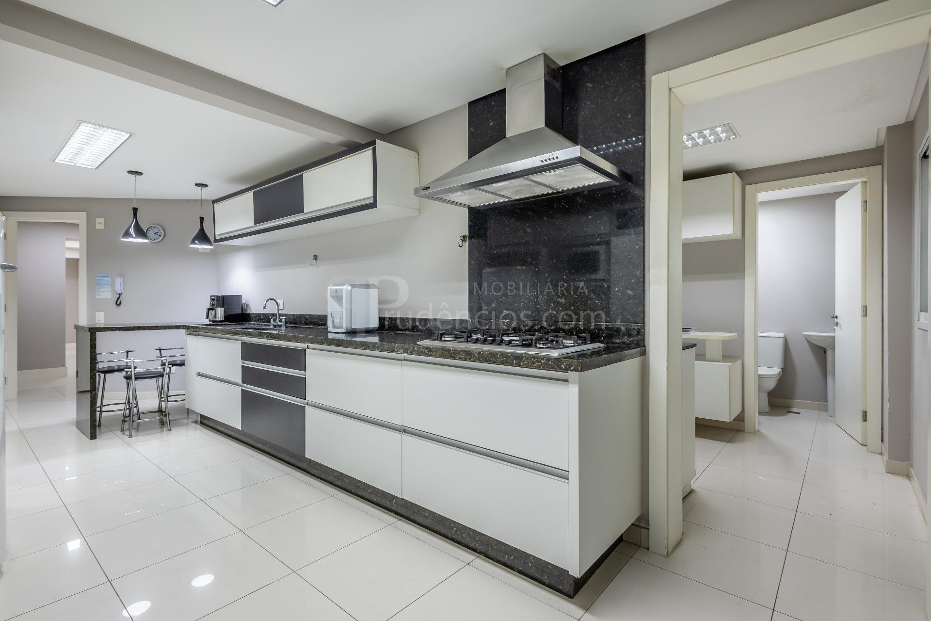 Varanda gourmet com churrasqueira a carvão e integrada a área social, proporcionando uma vista definitiva do mar. A cozinha e ampla e conta com espaço para mesa de café e refeições rápidas. Há ainda área de serviço independente e dependência de empregada.