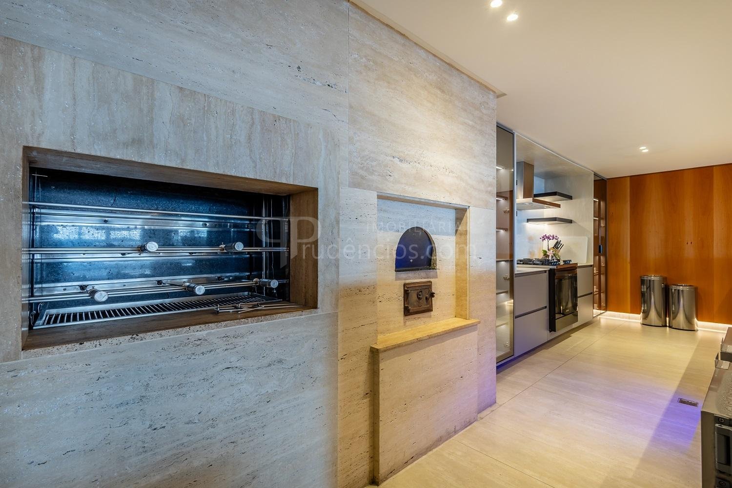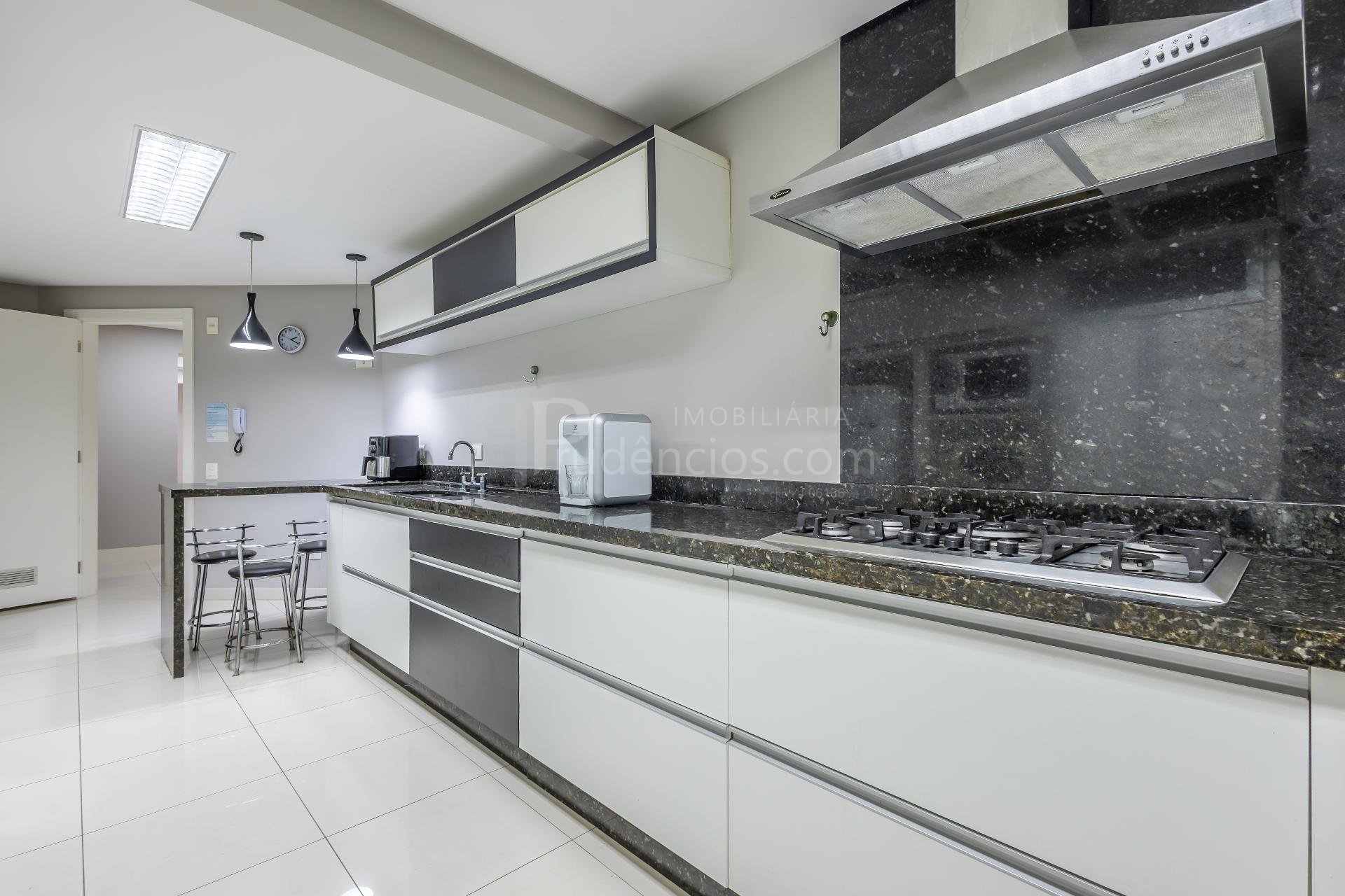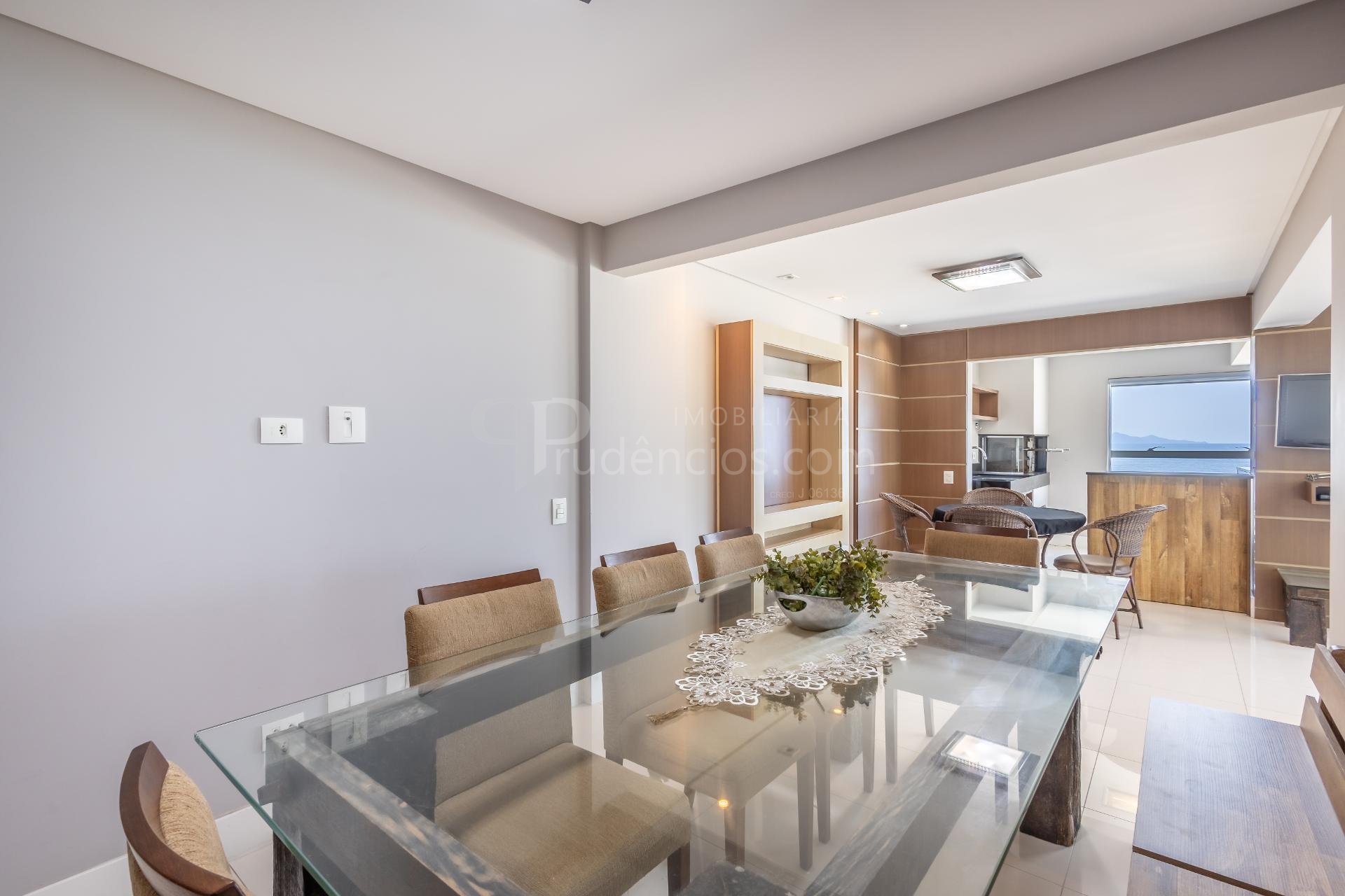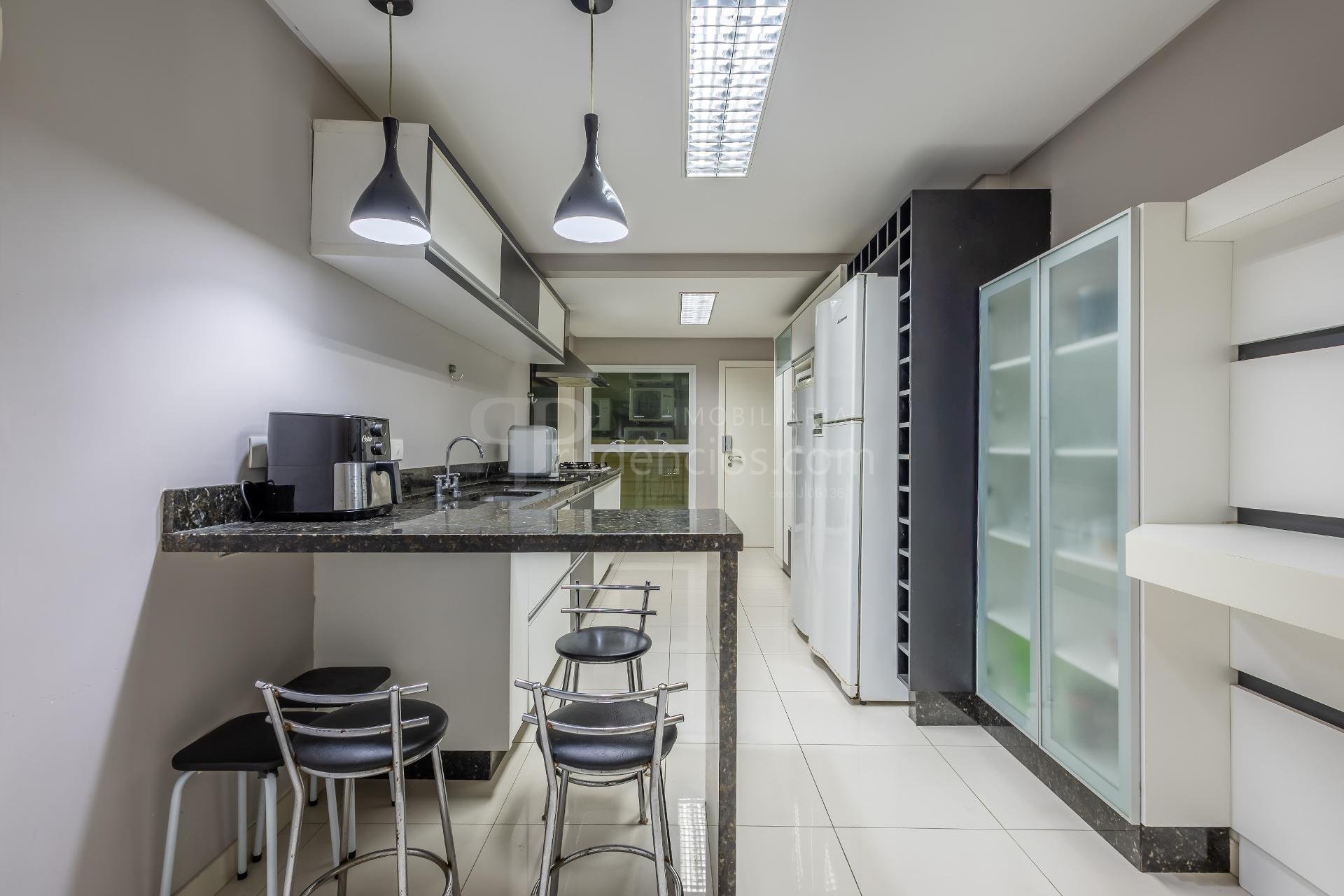Varanda gourmet com churrasqueira a carvão e integrada a área social, proporcionando uma vista definitiva do mar. A cozinha e ampla e conta com espaço para mesa de café e refeições rápidas. Há ainda área de serviço independente e dependência de empregada.