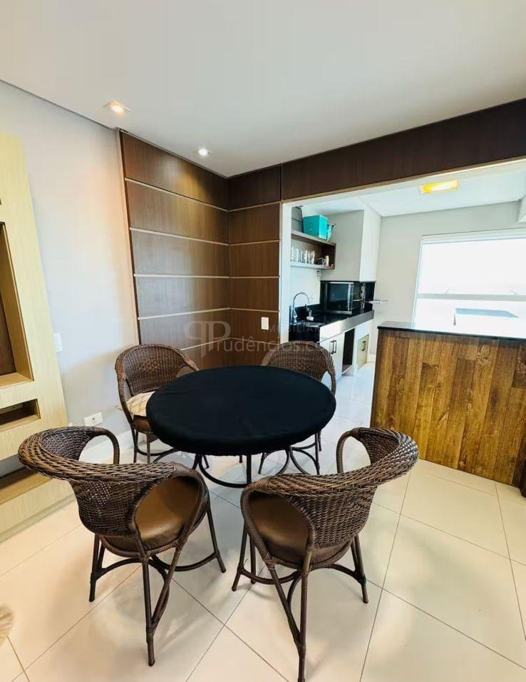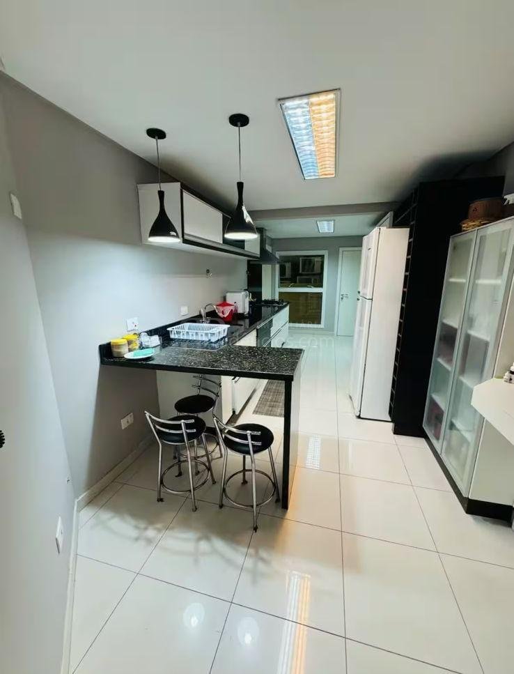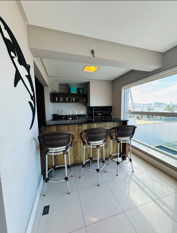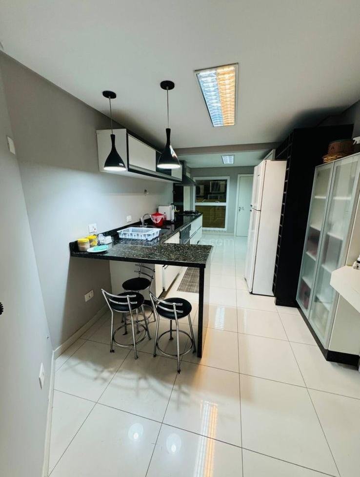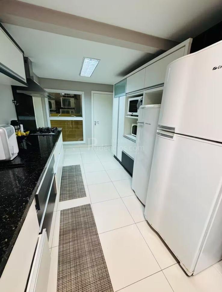 A varanda gourmet com churrasqueira a carvão e integrada a área social, proporcionando uma vista definitiva do mar. A cozinha e ampla e conta com espaço para mesa de café e refeições rápidas. Há ainda área de serviço independente e dependência de empregada.