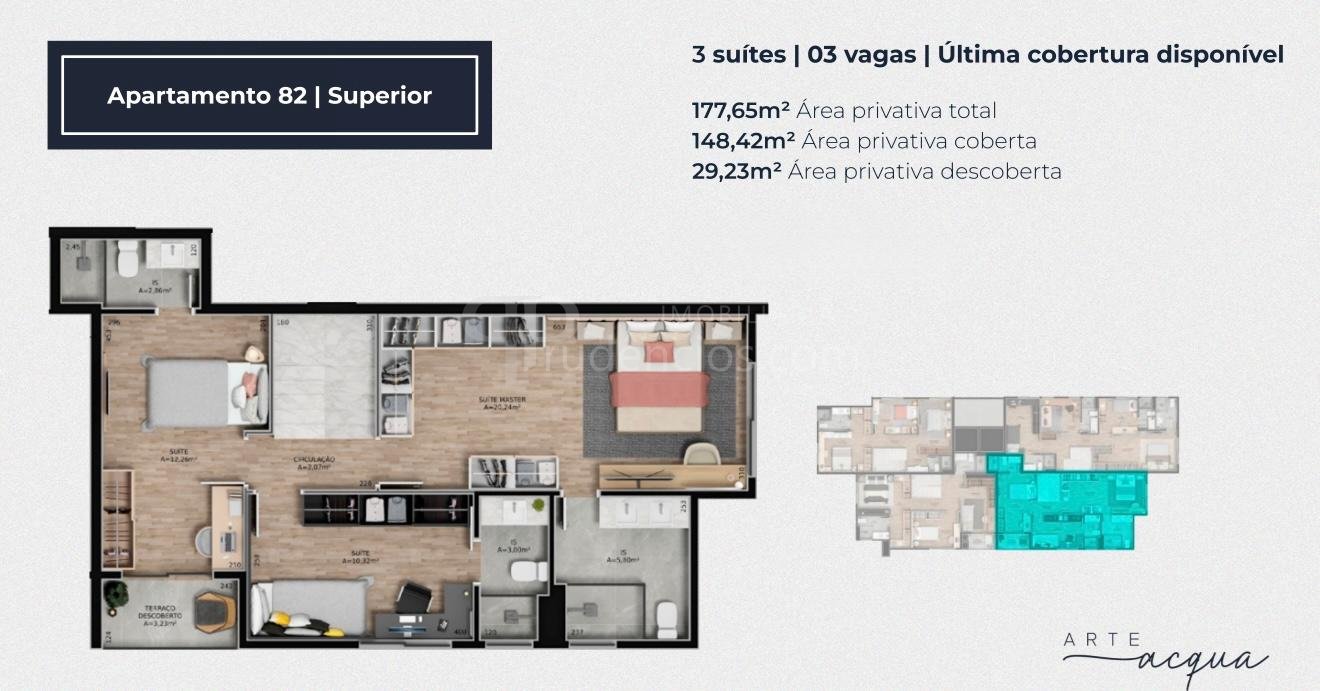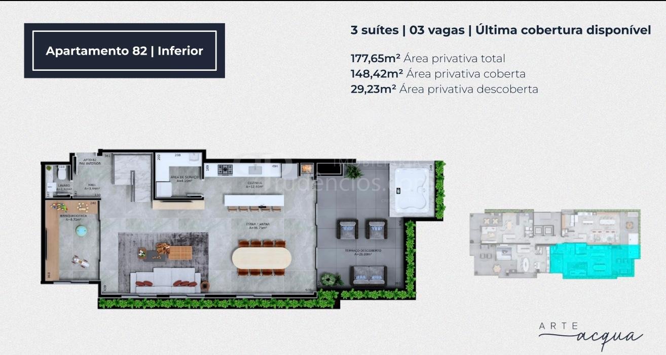 3 dormitorios e 3 vagas - Apartamento 82 Cobertura com 177,08m² (148,42m³ coberta e 28,66m² cobertura) - R$ 2.798.000,00