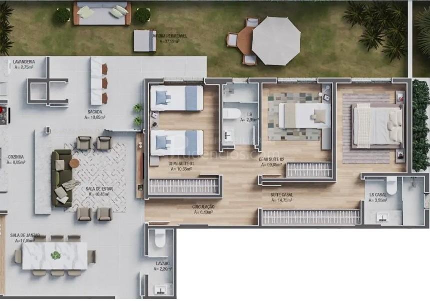 144,44 m² de área privativa (106,52 m² internos + 37,92 m² de garden descoberto com grama natural)