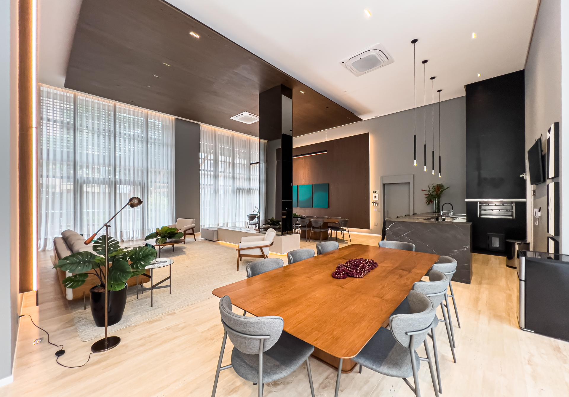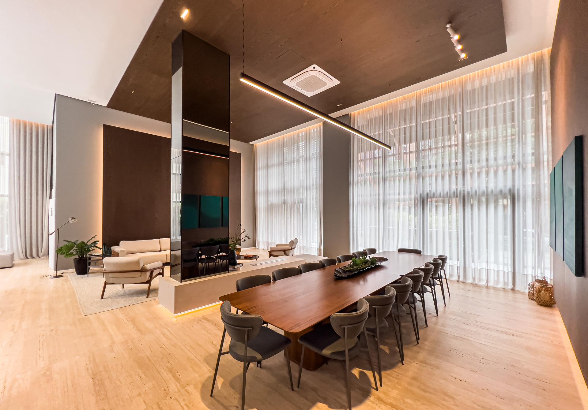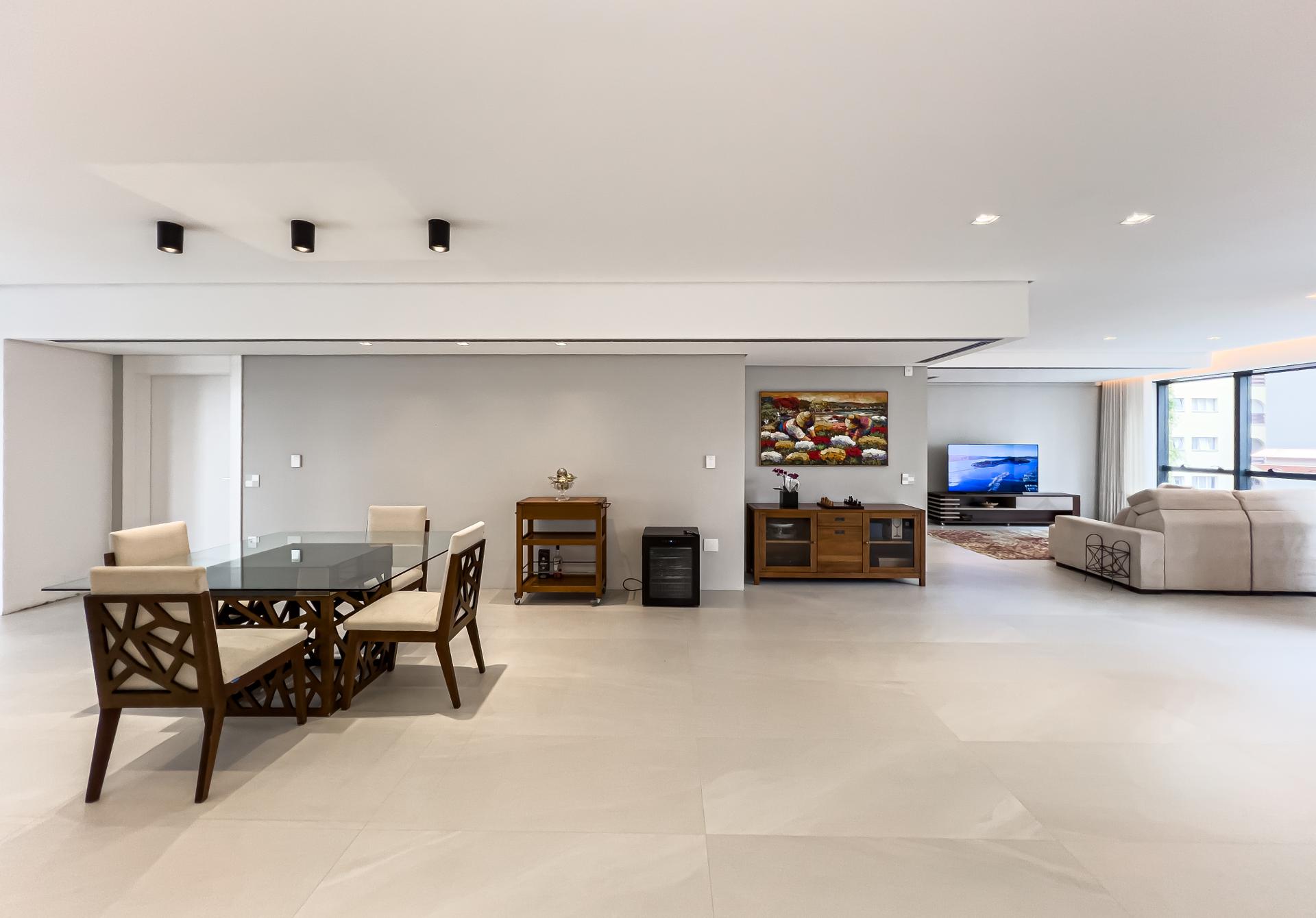 Com 227,98 m² privativos, o layout privilegia integração e funcionalidade, criando ambientes acolhedores e ao mesmo tempo sofisticados. Totalmente mobiliado com peças assinadas pela Mobitec, o apartamento conta com automação completa, permitindo o controle de iluminação, som e persianas blackout de forma simples e intuitiva.
