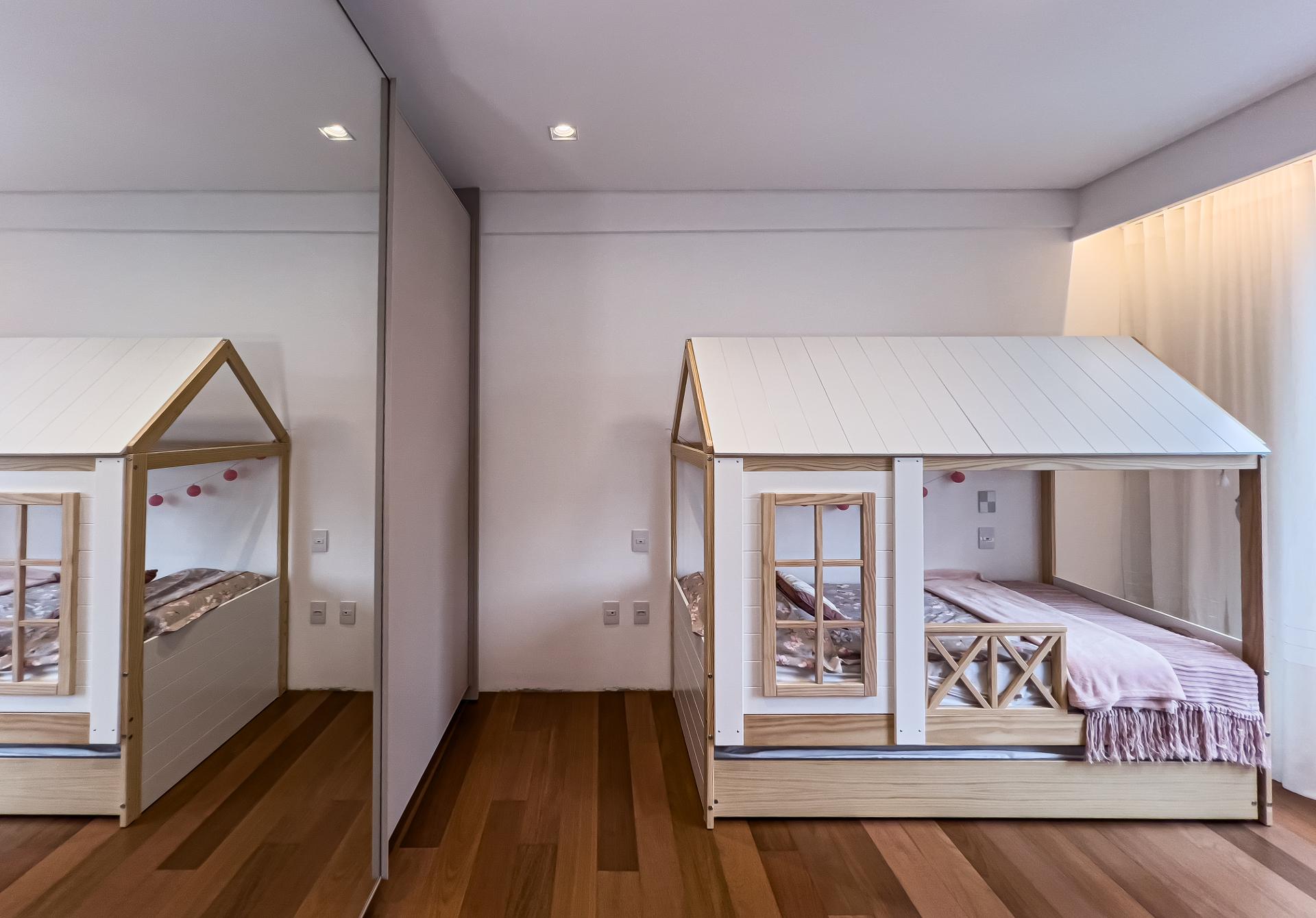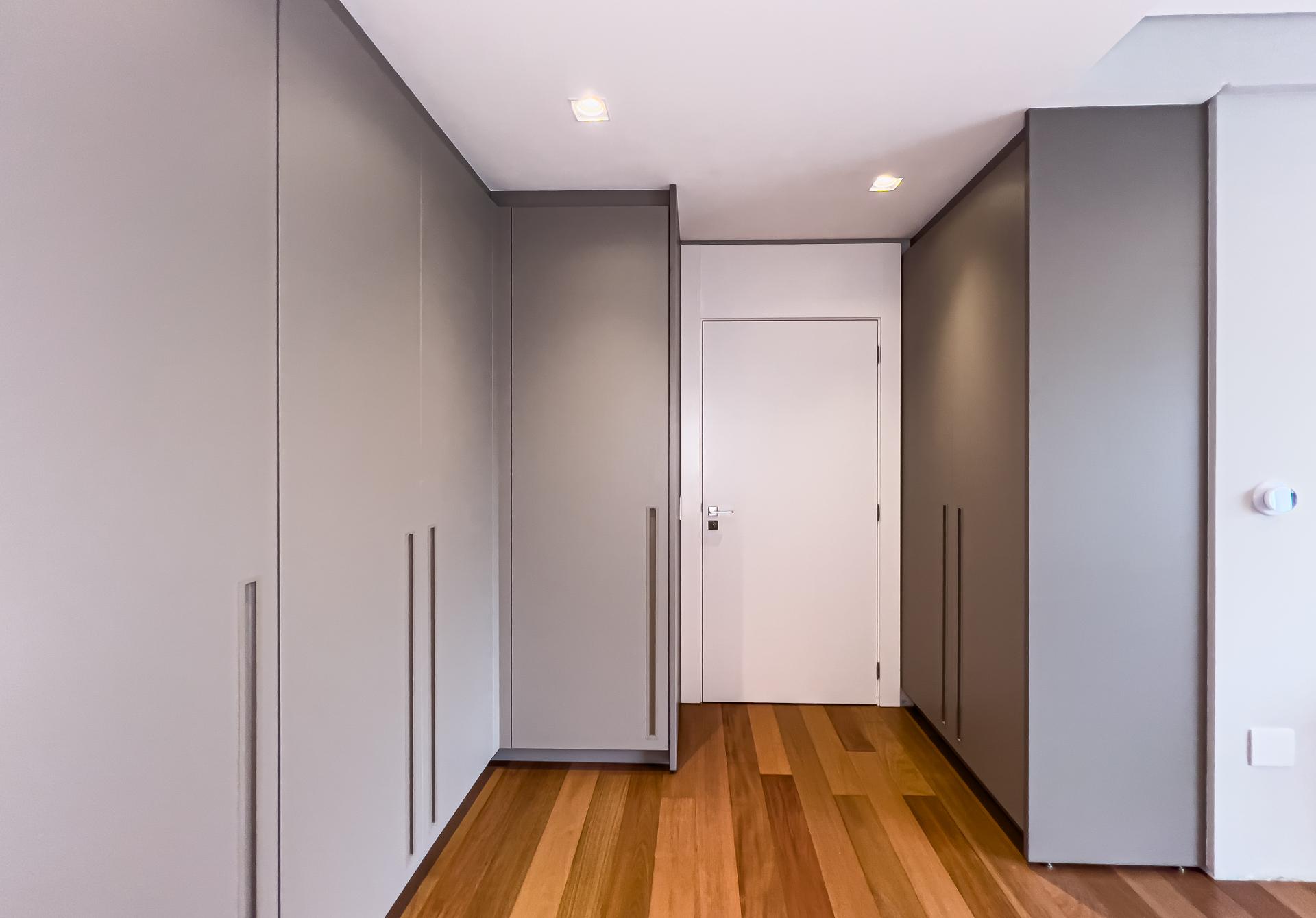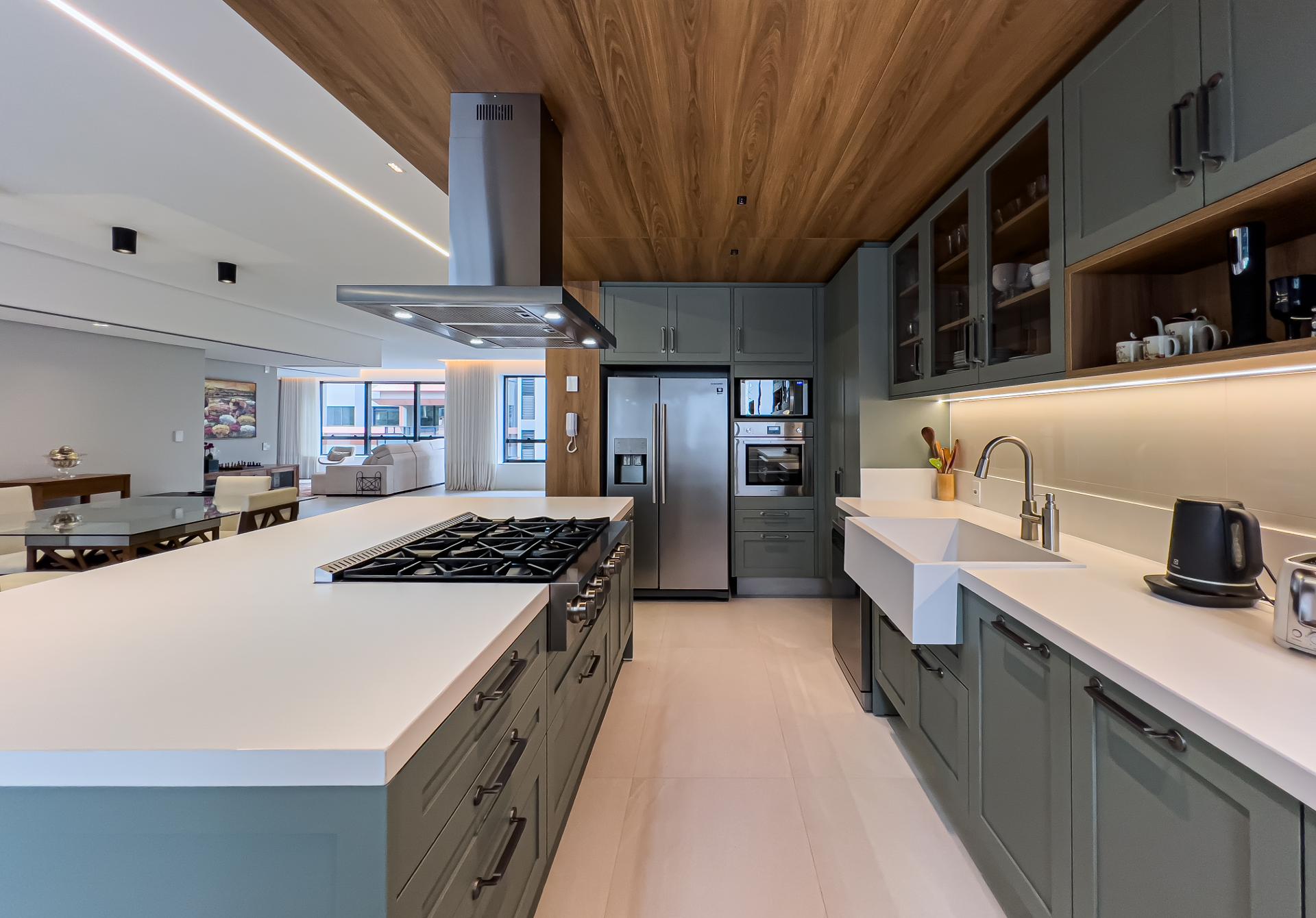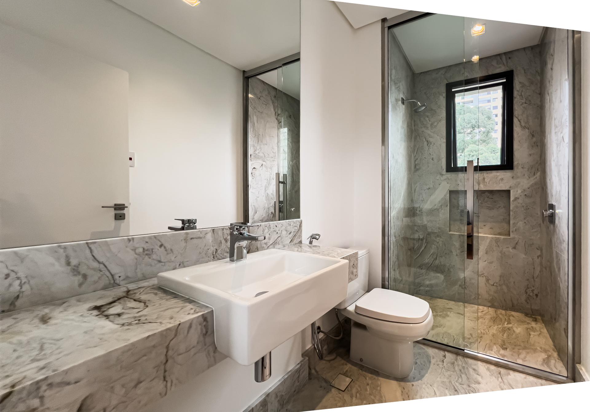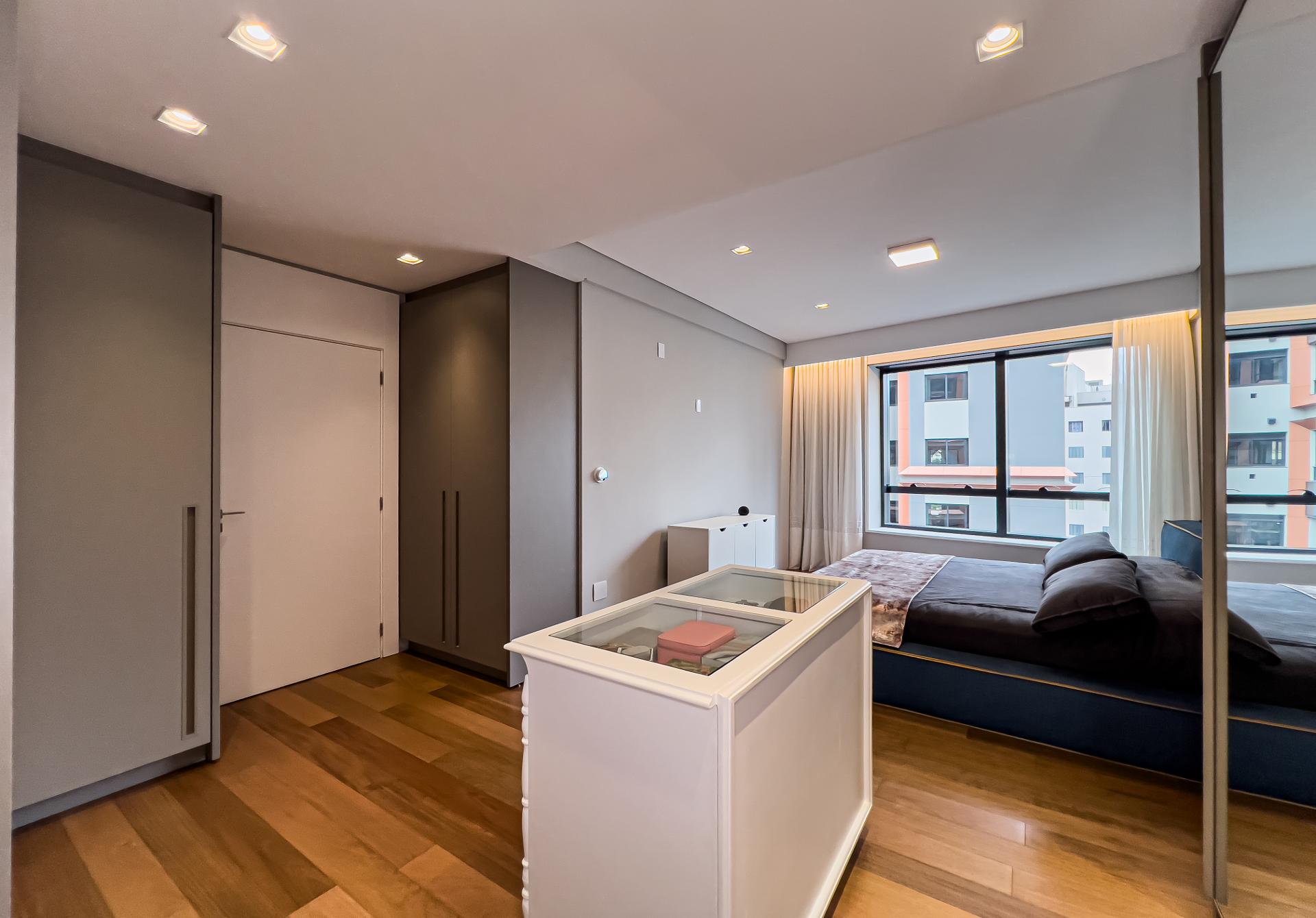 A área social apresenta cozinha integrada e acabamentos de alto padrão, ideal para receber. Na área íntima, o conforto é garantido pelo piso de madeira natural, enquanto porcelanatos Portobello valorizam os demais ambientes. Os banheiros são revestidos em mármore, com box do piso ao teto e iluminação embutida, reforçando a estética elegante e atemporal.