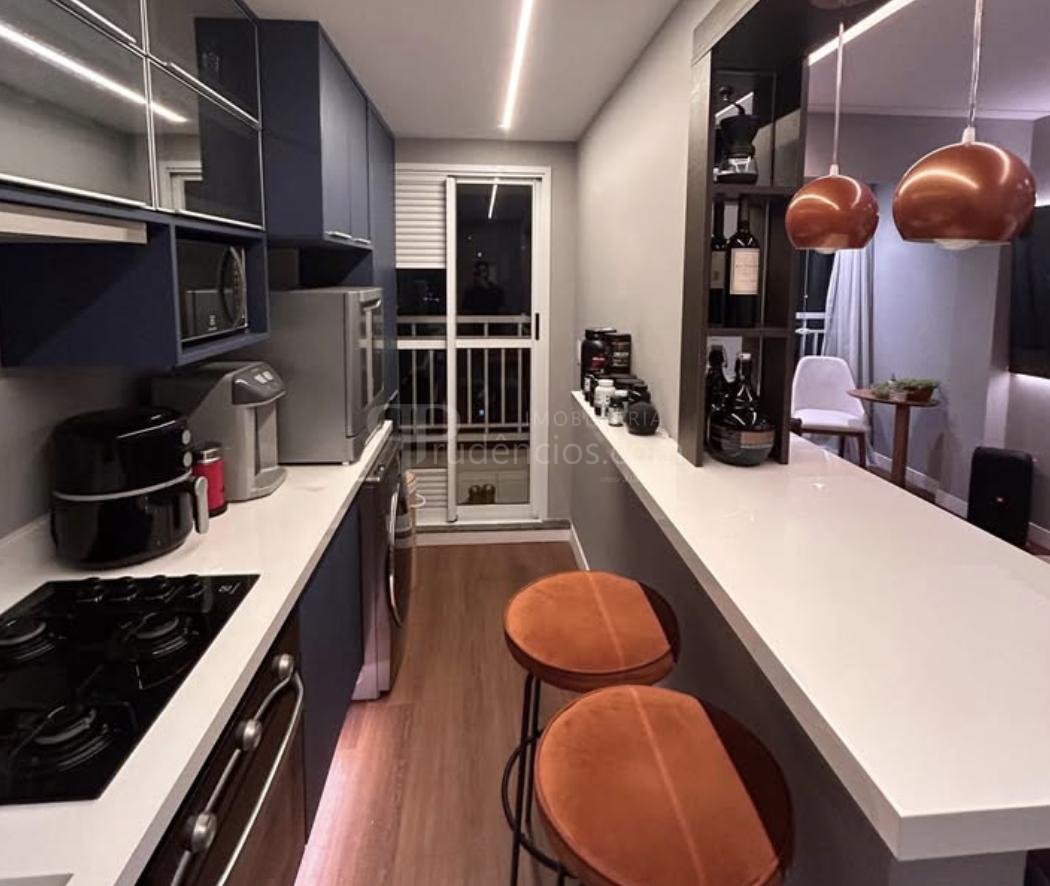 A cozinha planejada estilo gourmet possui excelente aproveitamento de espaço, bancada tipo bar, armários sob medida e lavanderia integrada.