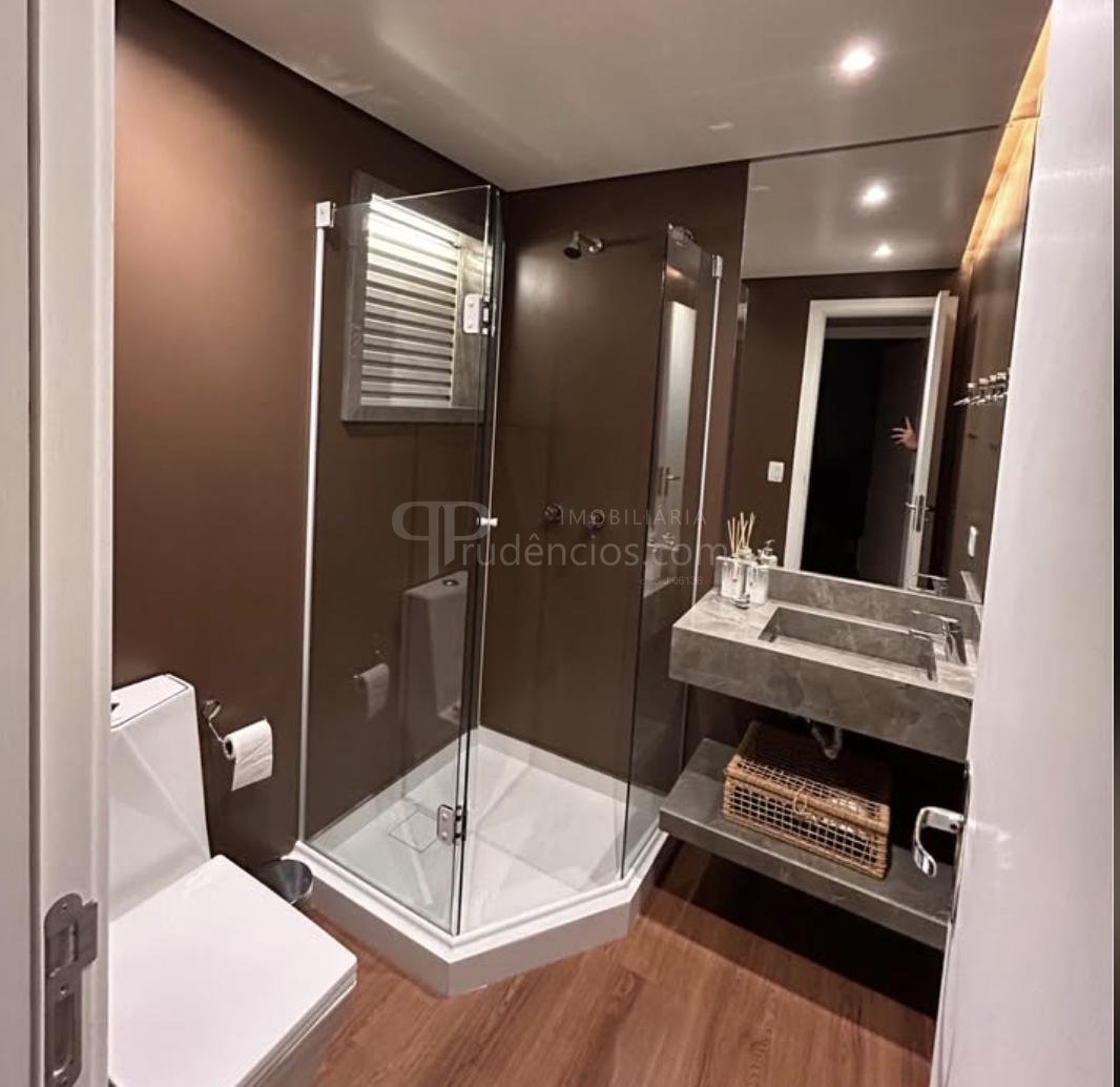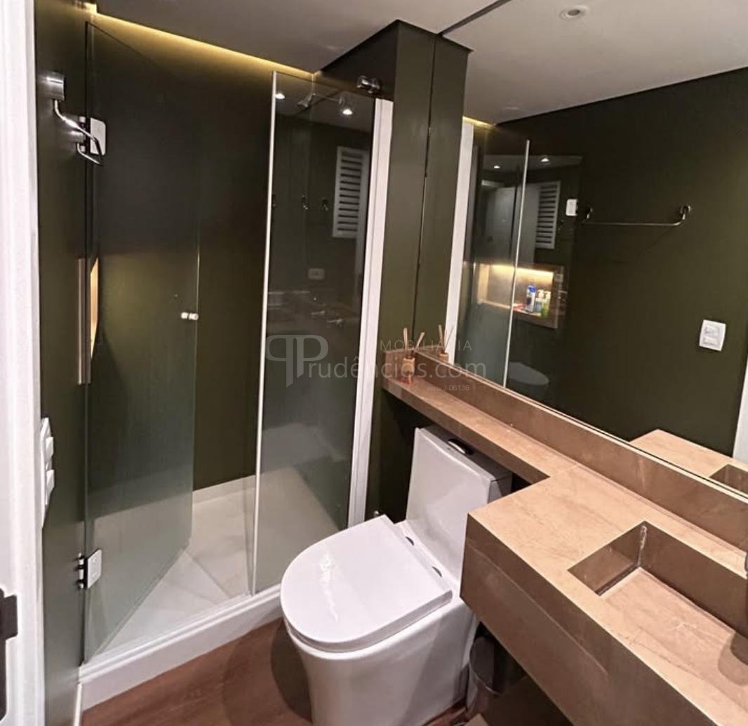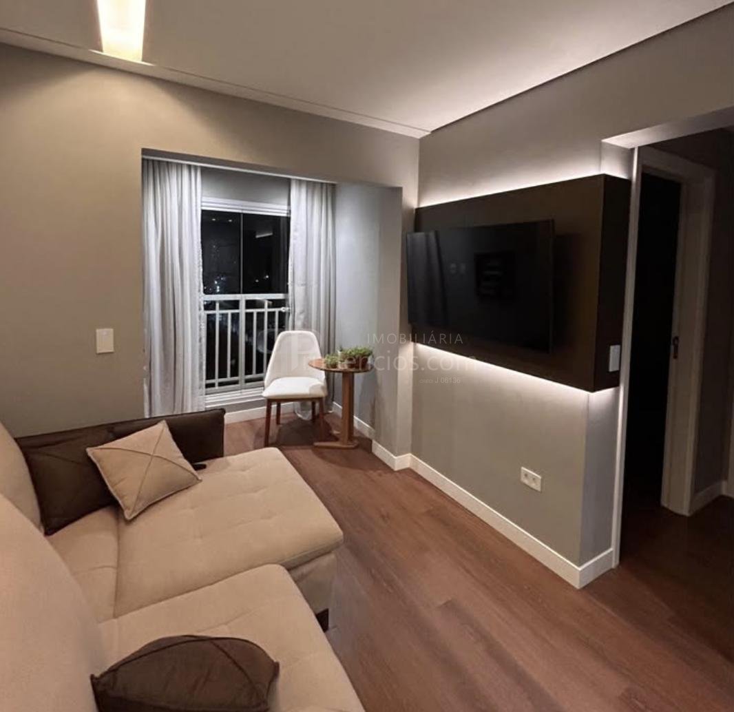 Com 60 m² de área privativa e 77 m² de área total, o apartamento apresenta um projeto contemporâneo com móveis planejados sob medida de alto padrão, piso vinílico em todos os ambientes e teto rebaixado em gesso com iluminação embutida. O sistema de automação via Alexa permite controlar iluminação e criar diferentes cenários de conforto.