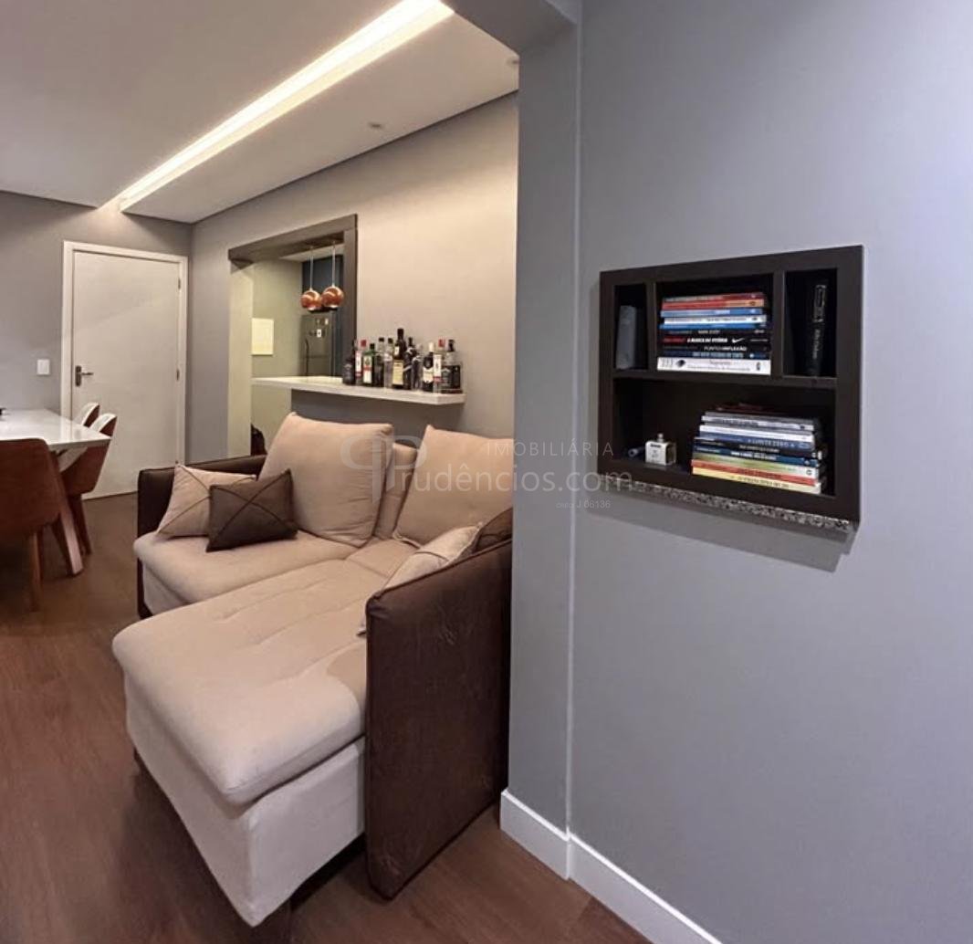 A área social é elegante e funcional, com sala para dois ambientes, painel planejado para TV e iluminação indireta que valoriza o ambiente. A integração com a cozinha cria um espaço moderno e prático para o dia a dia.