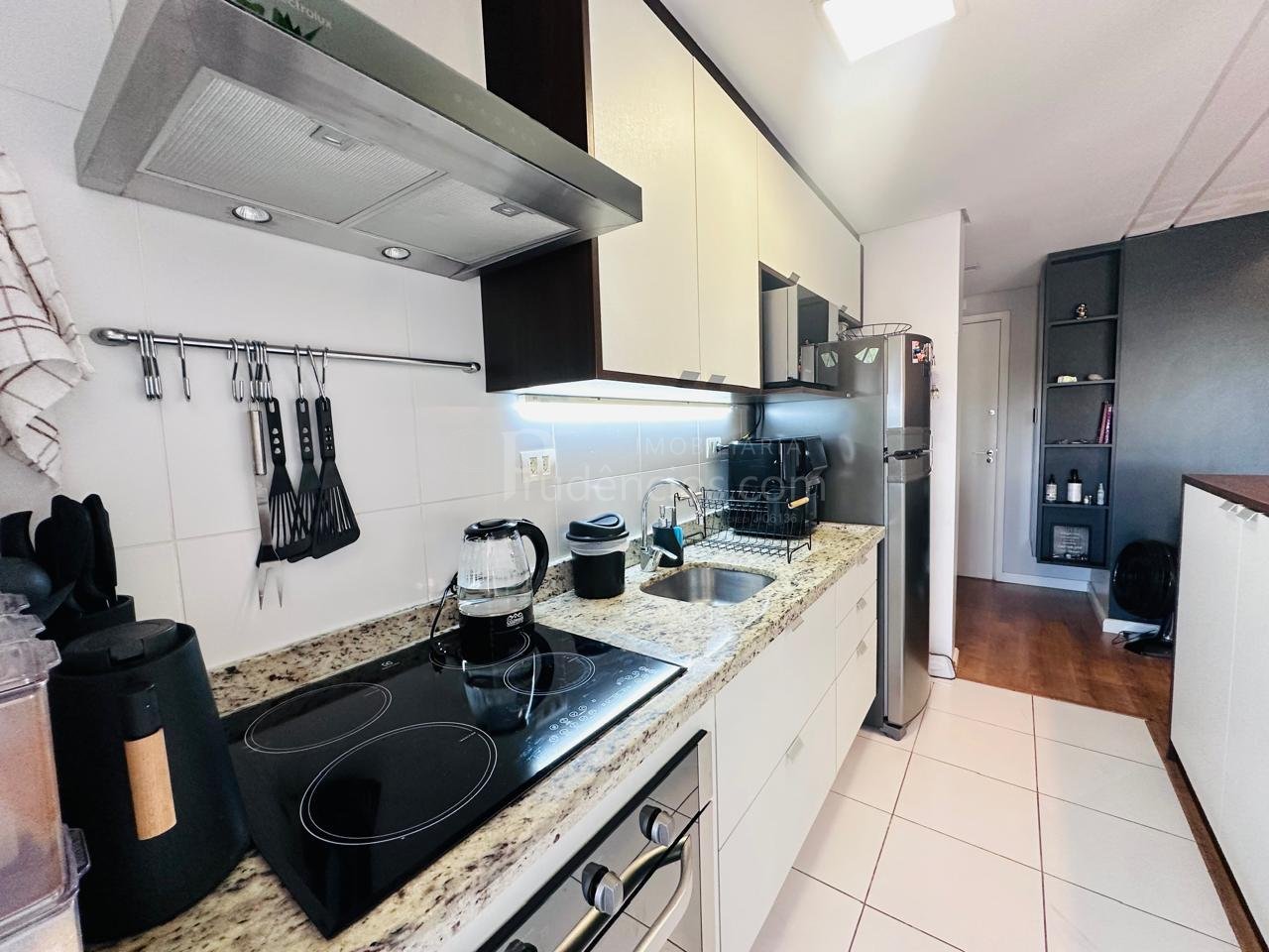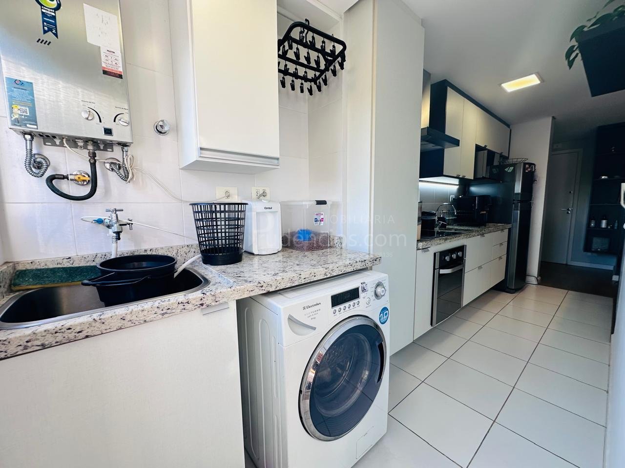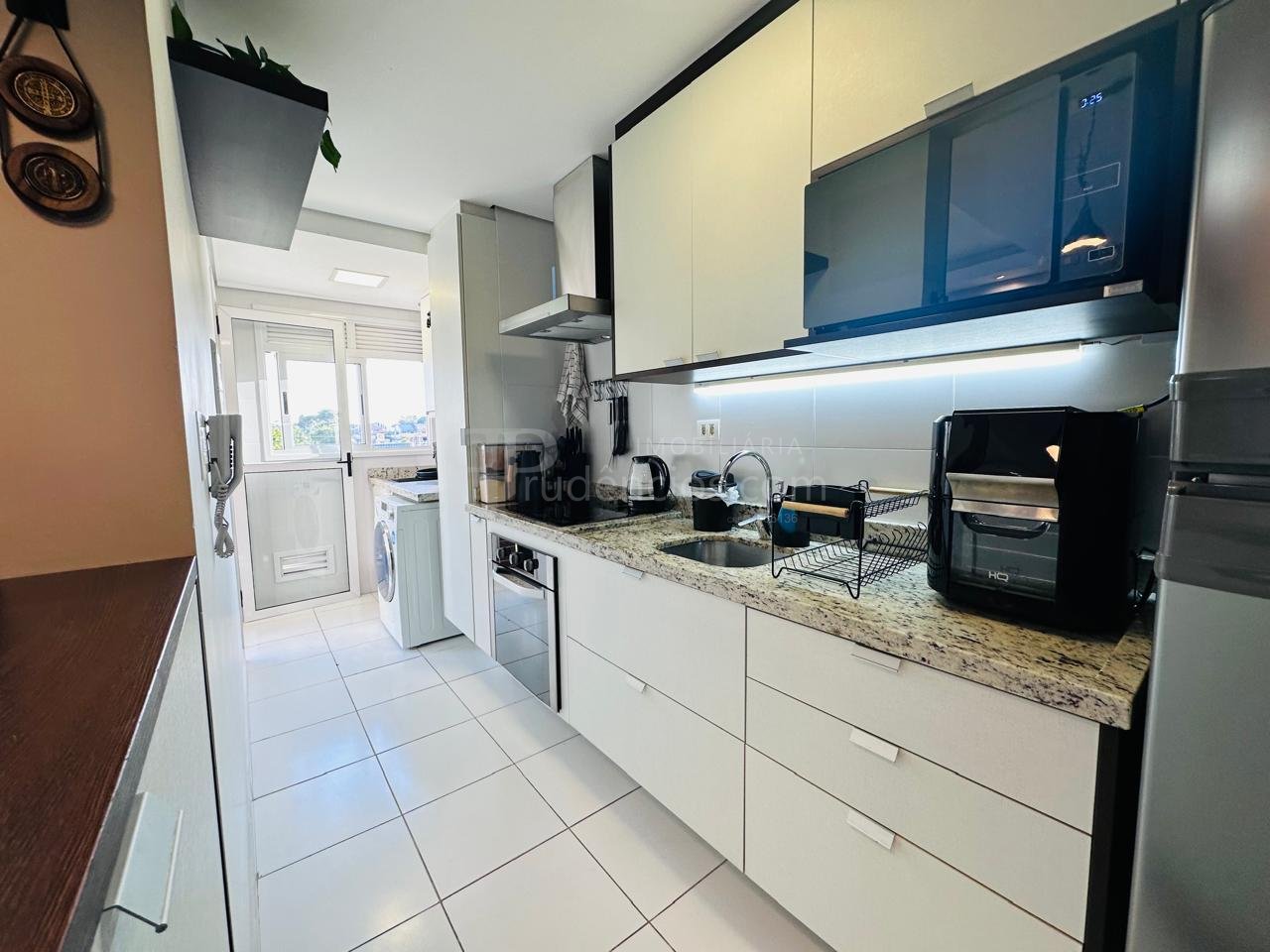 A cozinha é funcional e integrada à área de serviço, tornando o espaço mais prático para as atividades do dia a dia.