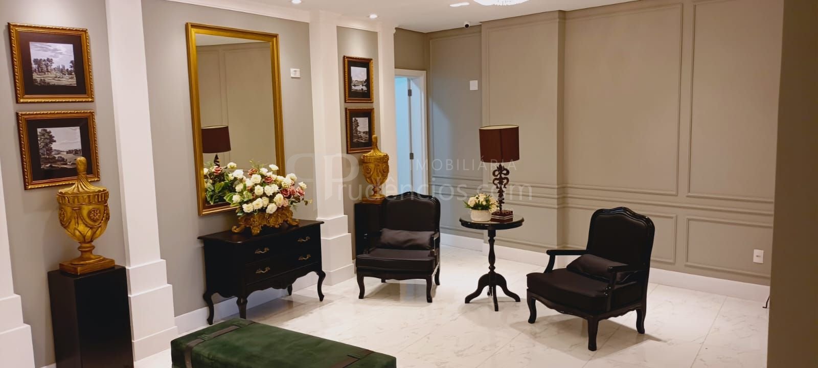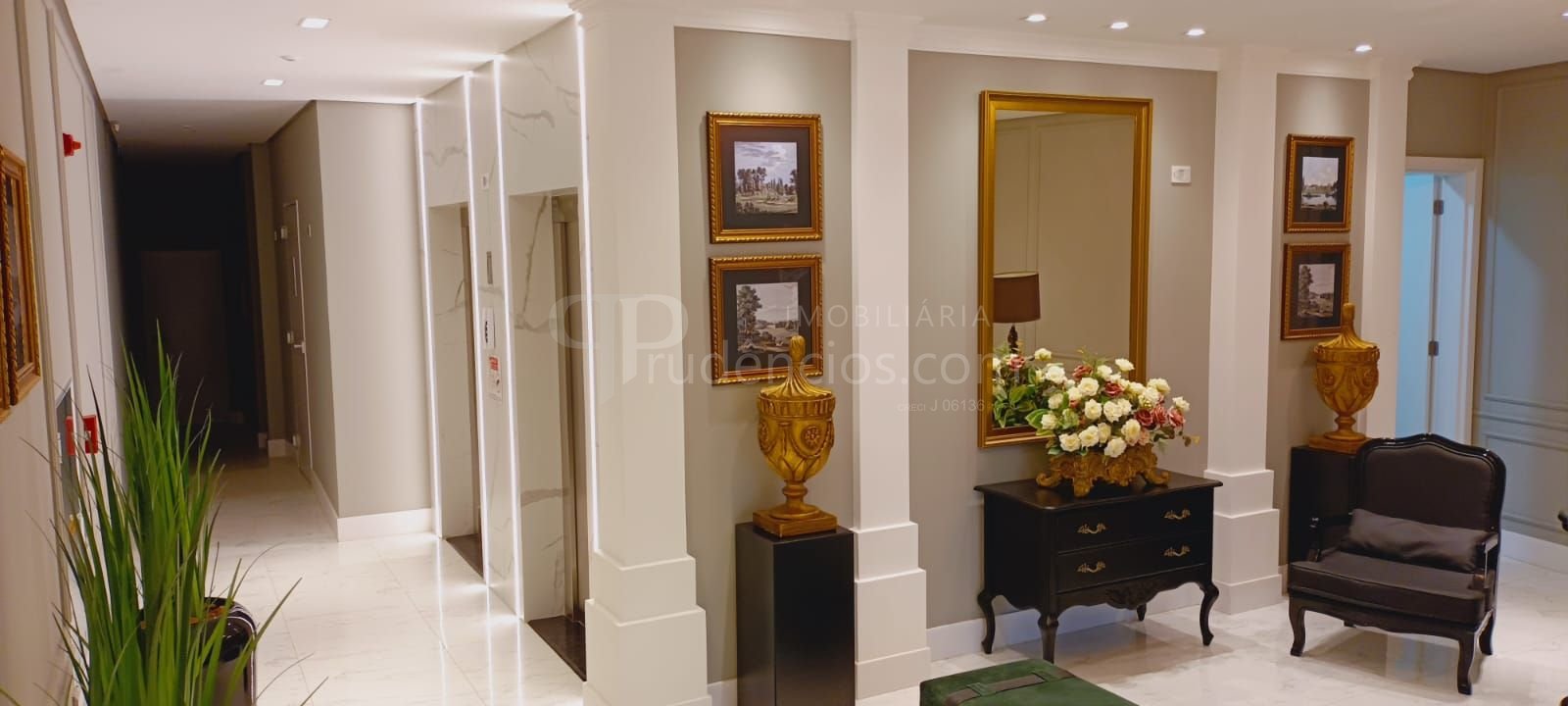 Hall de entrada decorado em estilo clássico, transmitindo elegância e requinte