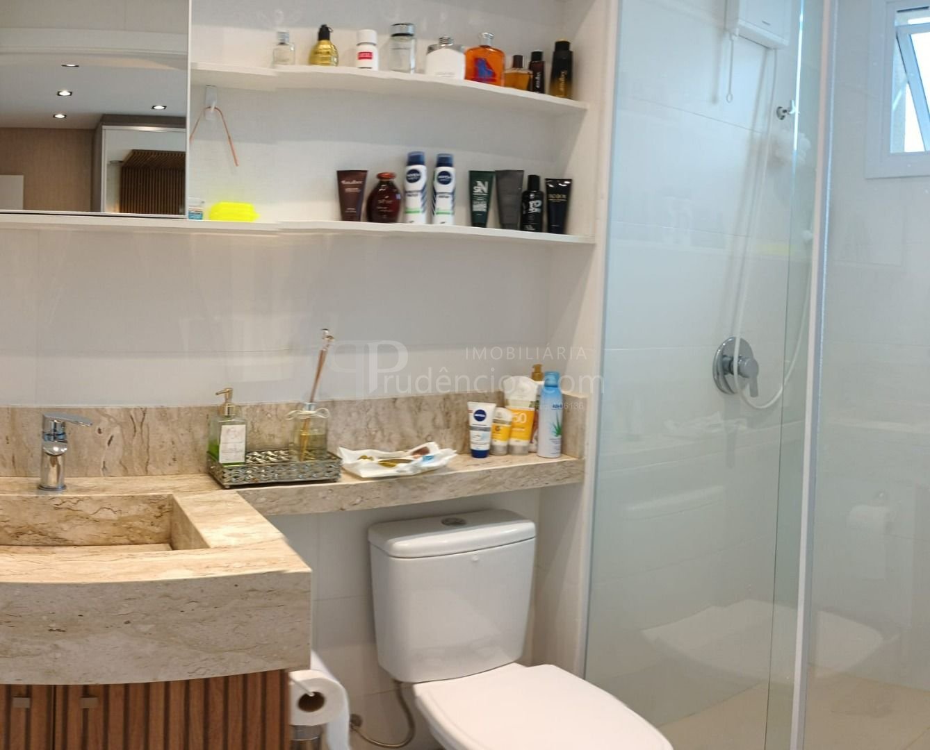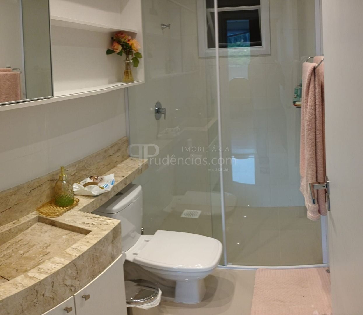 Banheiro social bem distribuído, com box de vidro do piso ao teto