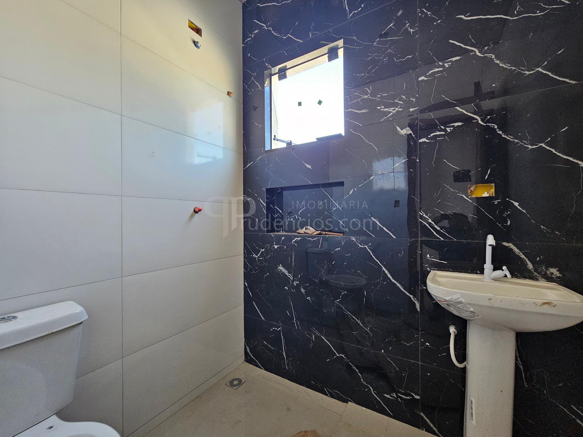 O banheiro social é bem distribuído e conta com nicho embutido, oferecendo praticidade e um toque contemporâneo ao ambiente. A casa também dispõe de área de serviço funcional, pensada para facilitar a rotina doméstica.
