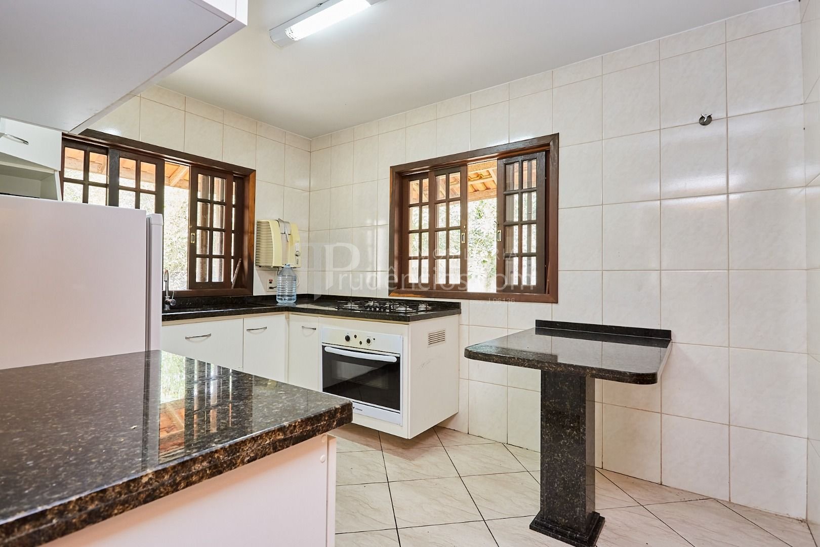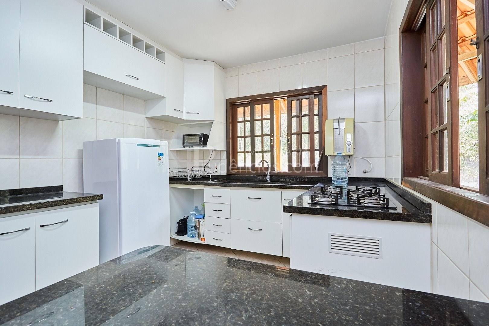 Cozinha ampla, ventilada, com armários embutidos.