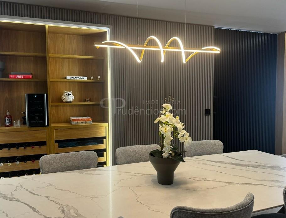 Cozinha americana com móveis alto padrão ,pedras toda em marmore branco Paraná e painéis ripados ,churrasqueira embutida