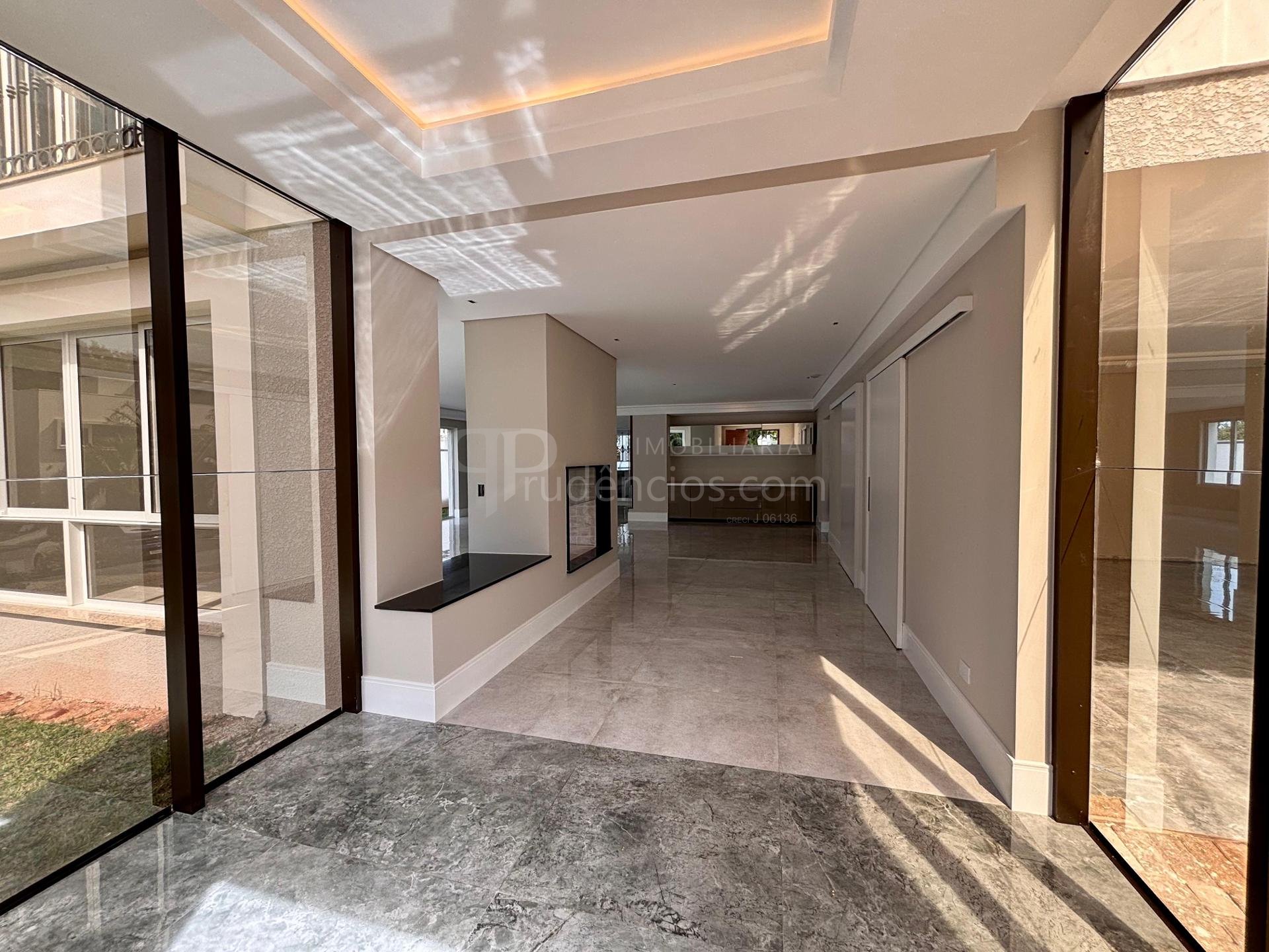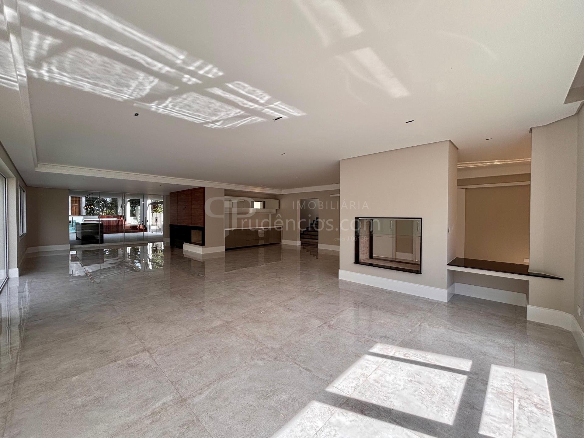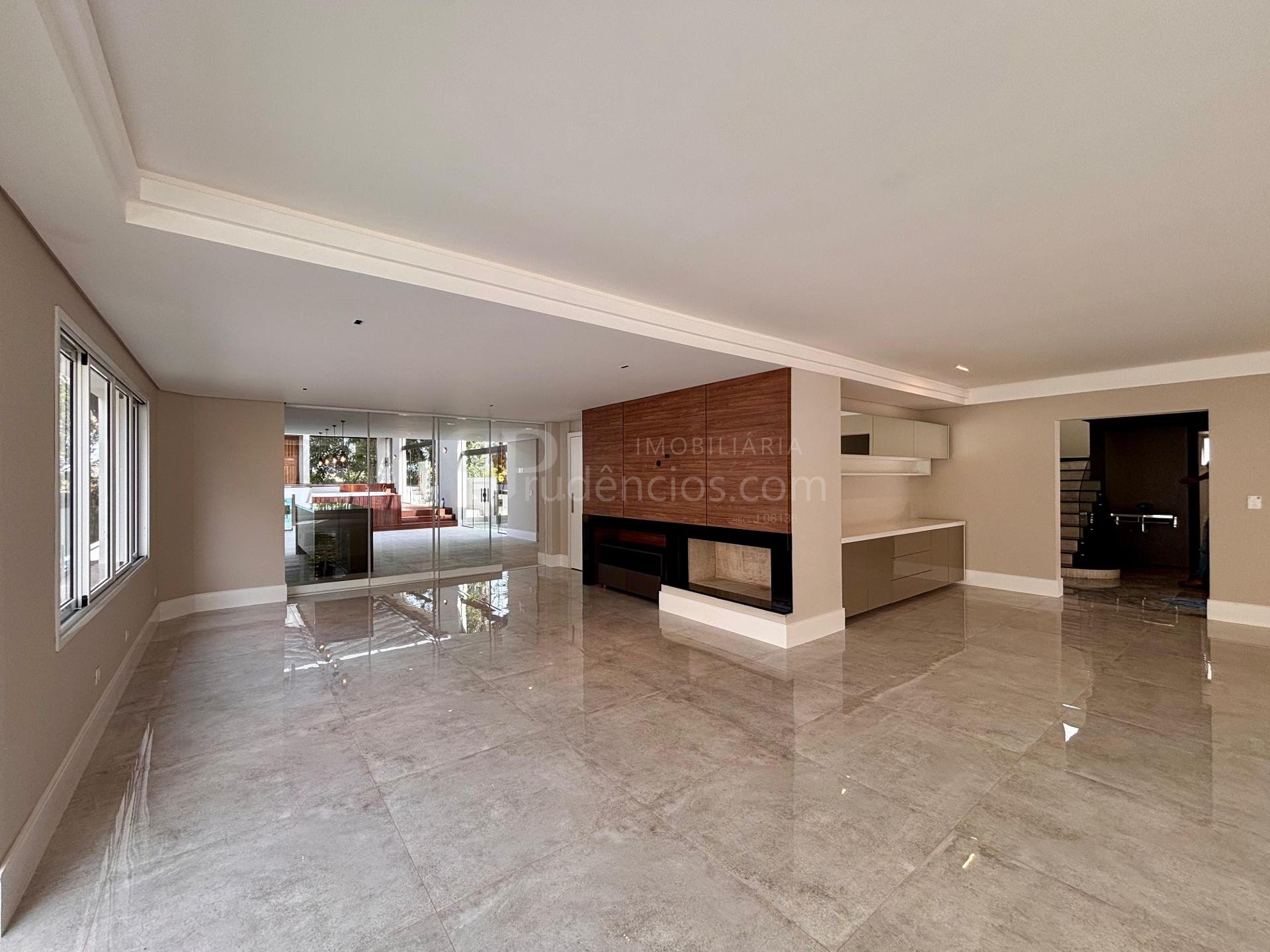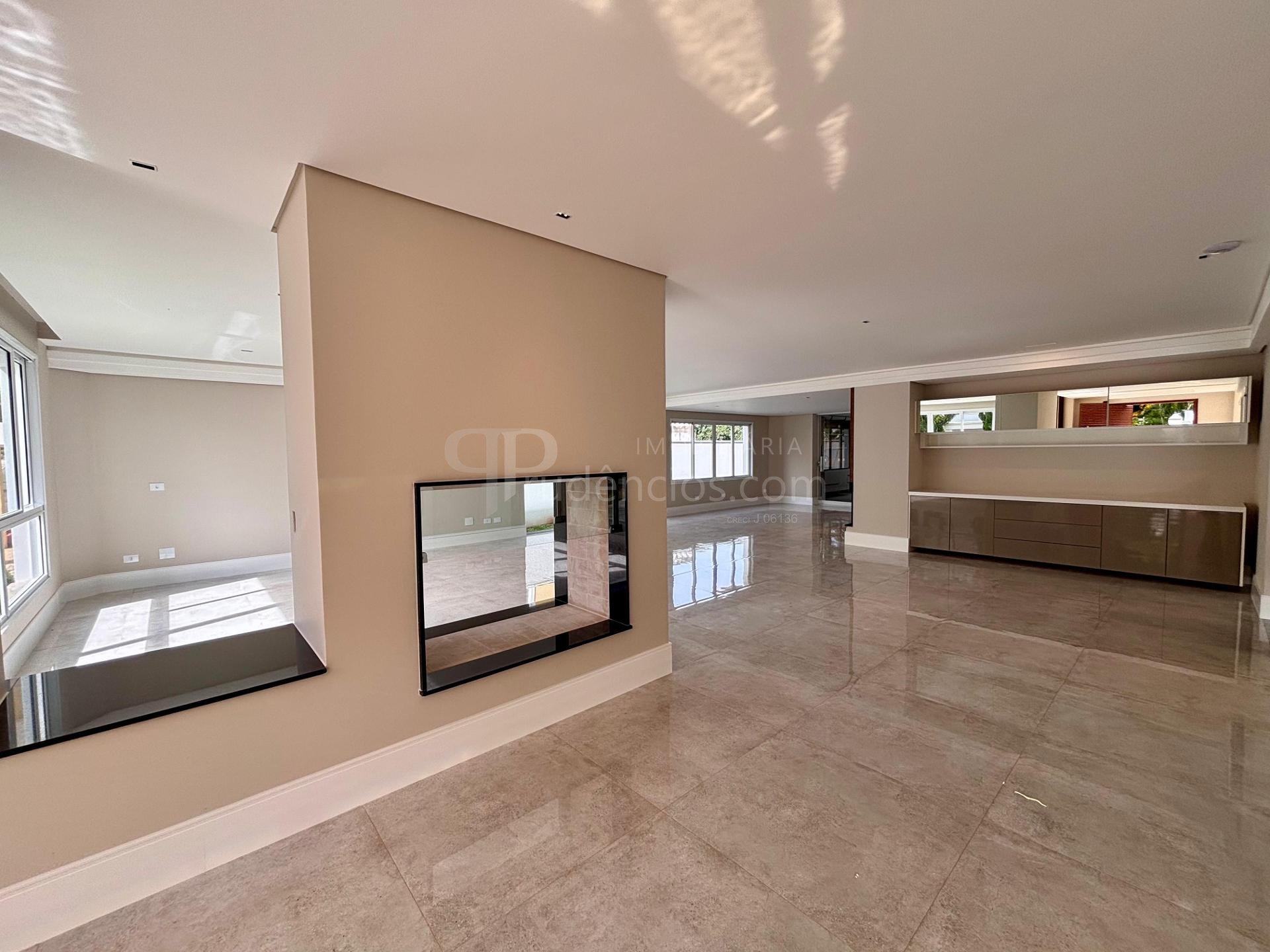 Sala ampla integrada, com lareira, piso em porcelanato e iluminação natural abundante