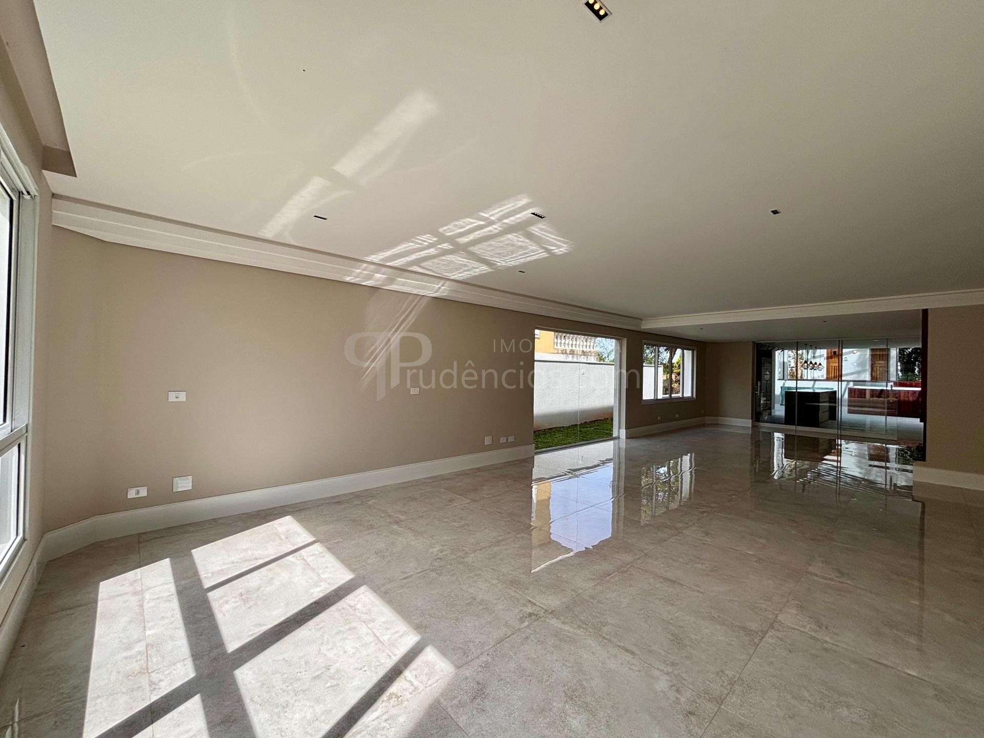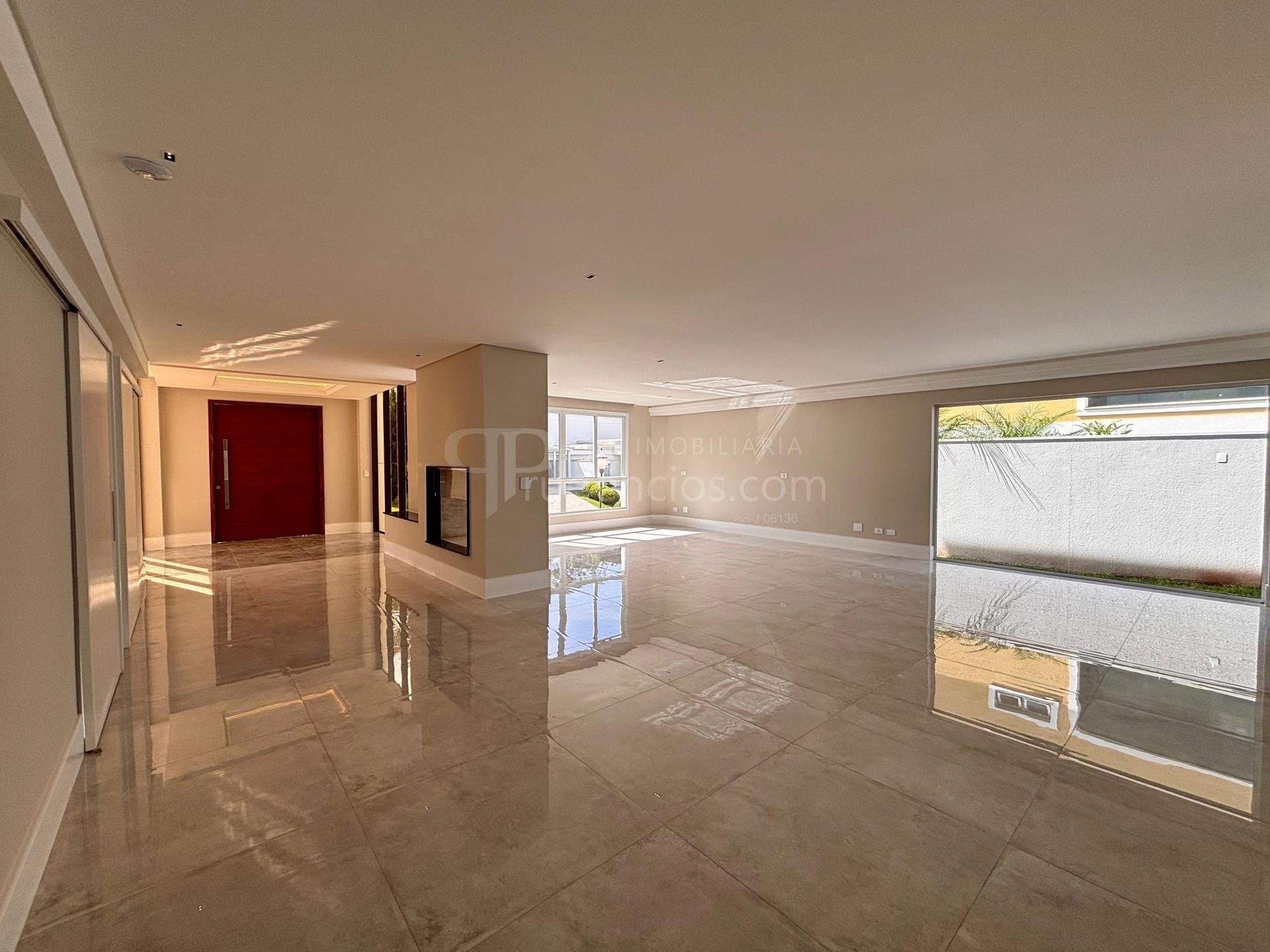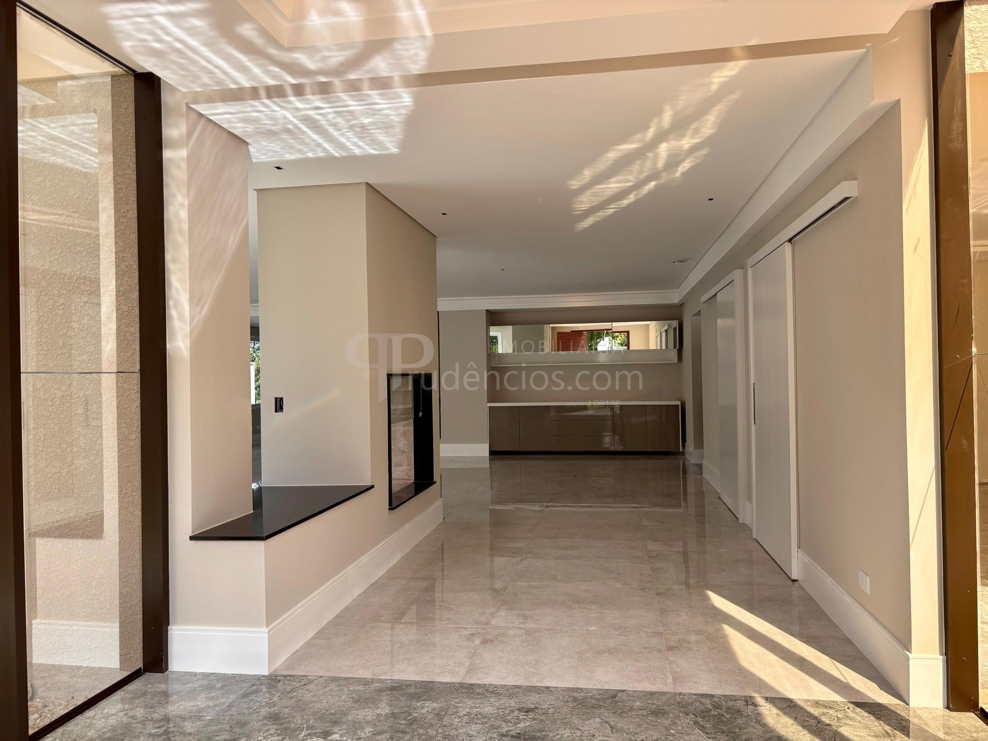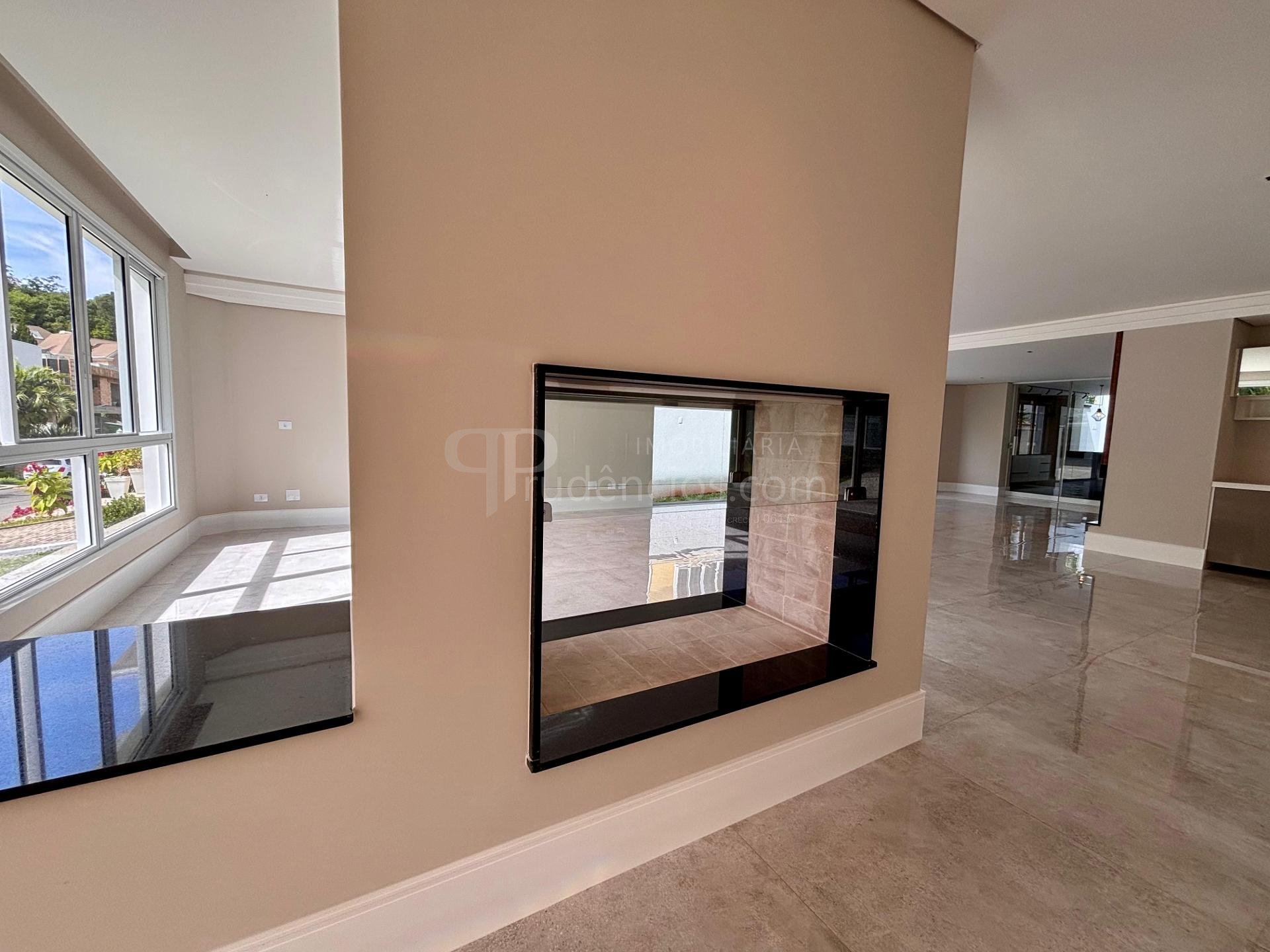 Sala ampla integrada, com lareira, piso em porcelanato e iluminação natural abundante