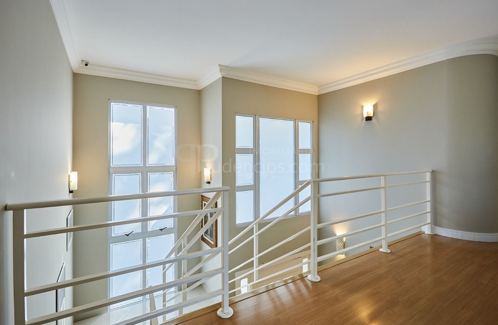 Pavimento superior sofisticado: mezanino multifuncional, home office com vista panorâmica e três suítes com sacada.