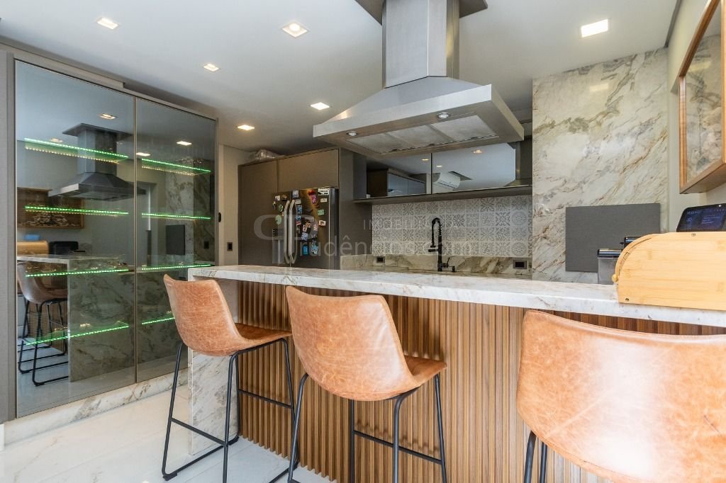 No térreo temos a cozinha toda equipada integrada, espaço gourmet com churrasqueira, as salas de jantar e estar, lavabo, lavanderia e um jardim de inverno. 2 vagas de garagens paralelas.