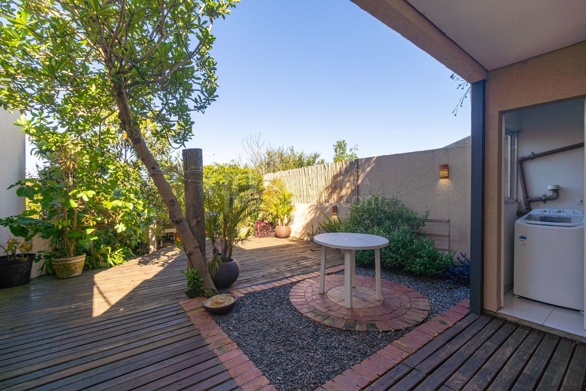 A área externa convida a momentos de lazer e descanso, com deck em madeira, quintal com árvores frutíferas e edícula com churrasqueira, criando um espaço acolhedor para receber amigos e familiares.