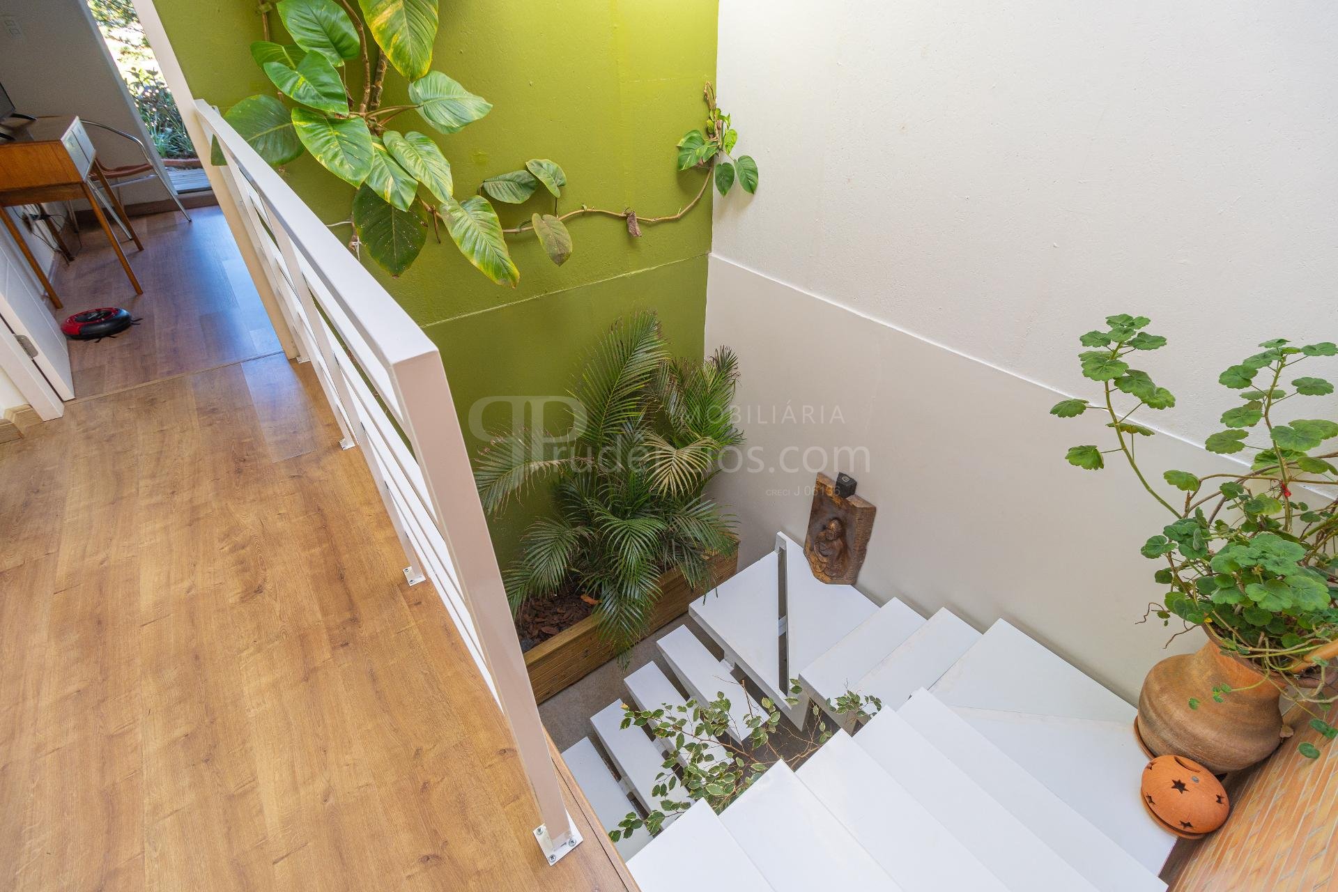 A escada com mezanino e o telhado de vidro valorizam o projeto arquitetônico, ampliando a entrada de luz natural e trazendo leveza aos ambientes. Os amplos terraços com paisagismo reforçam a conexão com o exterior e elevam a sensação de bem-estar.