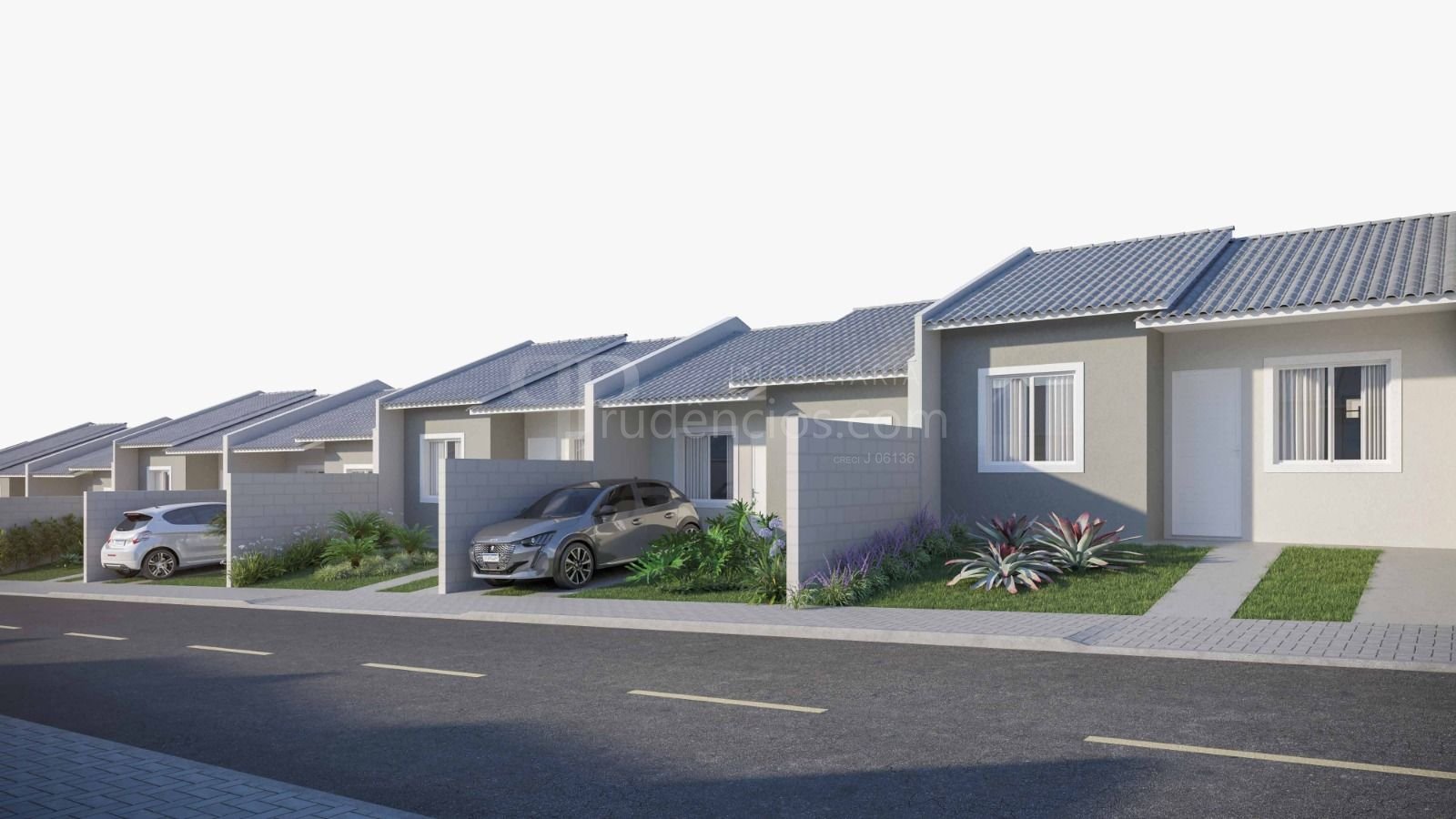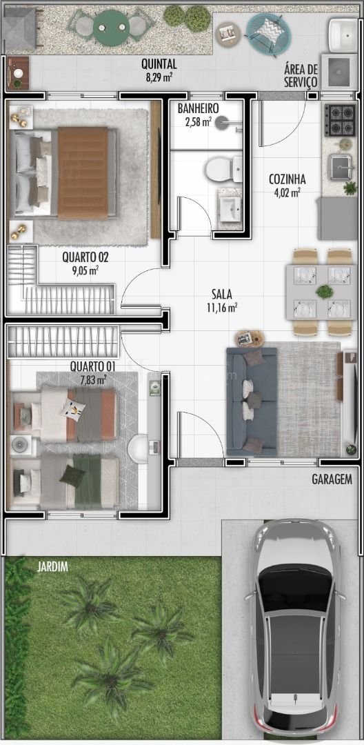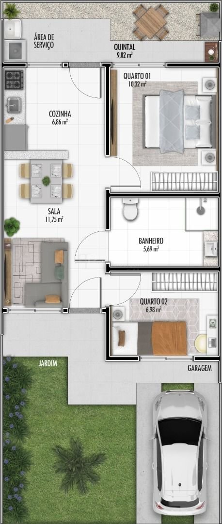 Com 42 m² de área privativa, cada casa oferece um projeto inteligente, que inclui cozinha, sala de estar, quarto de casal, quarto de solteiro, banheiro, quintal e vaga de garagem, garantindo funcionalidade e conforto para o cotidiano.