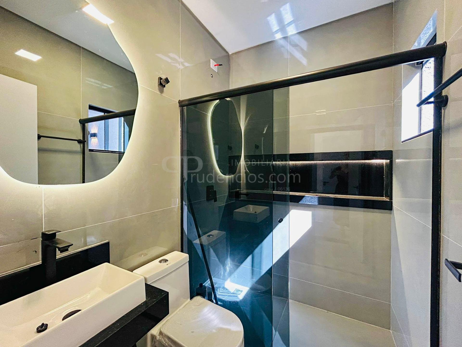 Banheiros completos, com box, nicho em mármore, pia e espelho