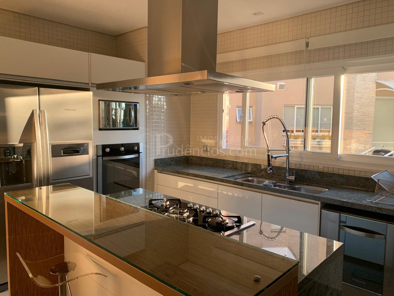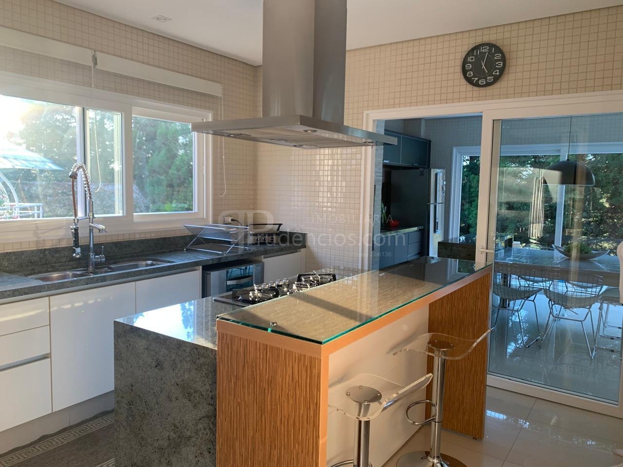 O pavimento térreo reúne os principais ambientes sociais da casa. A cozinha é ampla e totalmente planejada, com ilha central, bancadas em granito, pia tripla em inox e eletrodomésticos embutidos, incluindo cooktop, coifa de ilha, forno com grill, micro-ondas, lava-