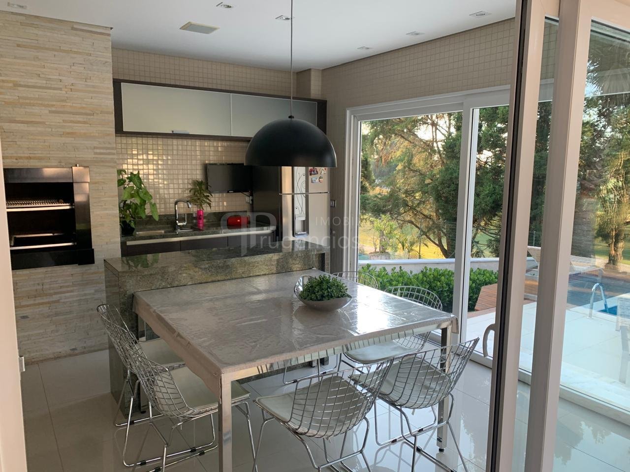 louças e geladeira side-by-side. Integrado à cozinha, o espaço gourmet conta com churrasqueira, bancadas em granito, armários planejados e ambiente ideal para receber convidados. A área externa possui varanda mobiliada, piscina com espaço para descanso e paisagismo, criando um ambiente agradável