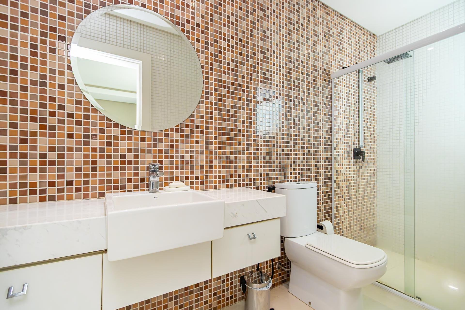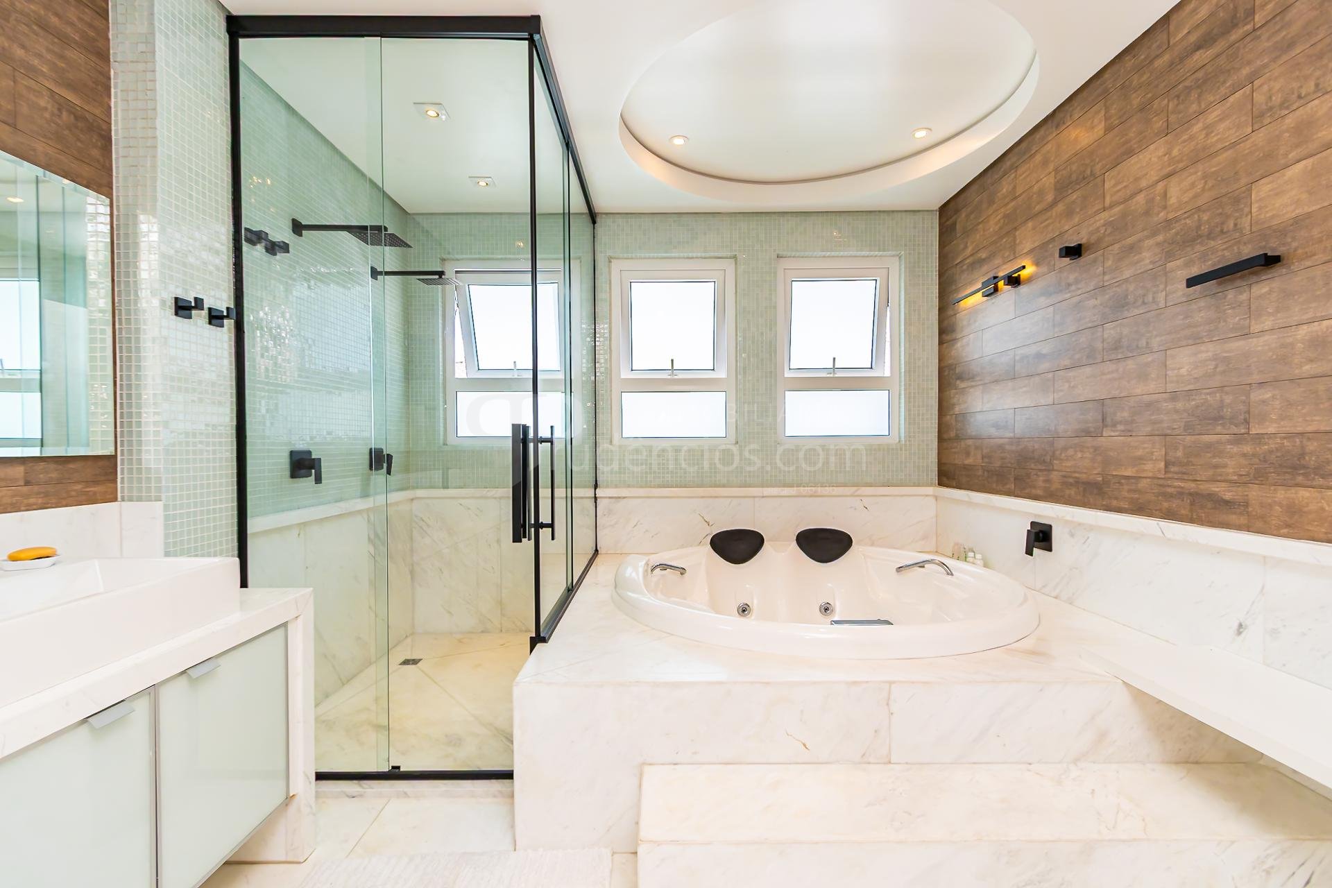 São 4 suítes generosas, todas acompanhadas por banheiros revestidos em mármore grego branco Carrara, traduzindo atemporalidade e requinte. O living social impressiona pelo pé-direito de 7 metros, lareira e integração entre estar e jantar, com acabamento nobre em mármore Crema Marfil espanhol, presente também na escada.