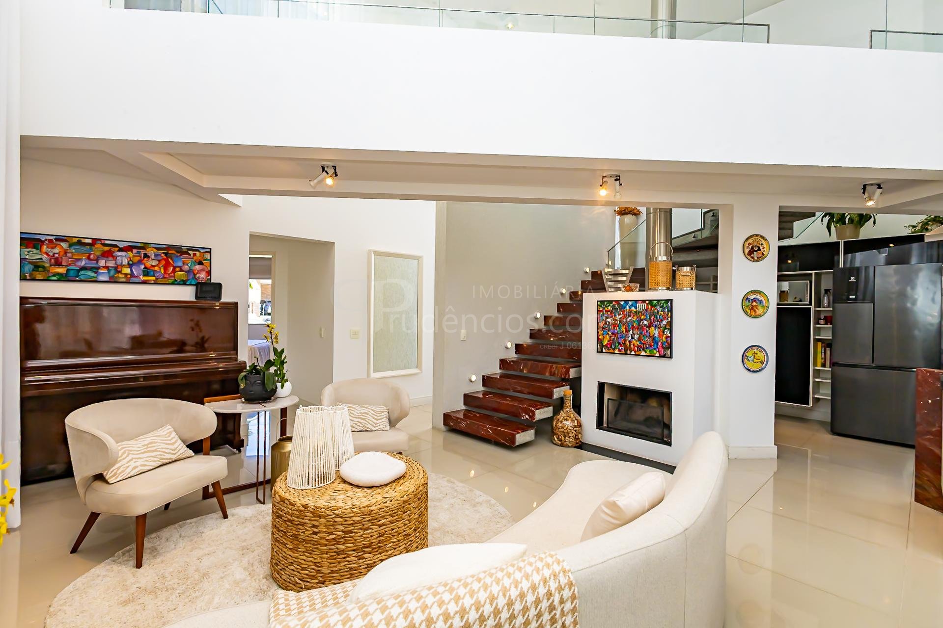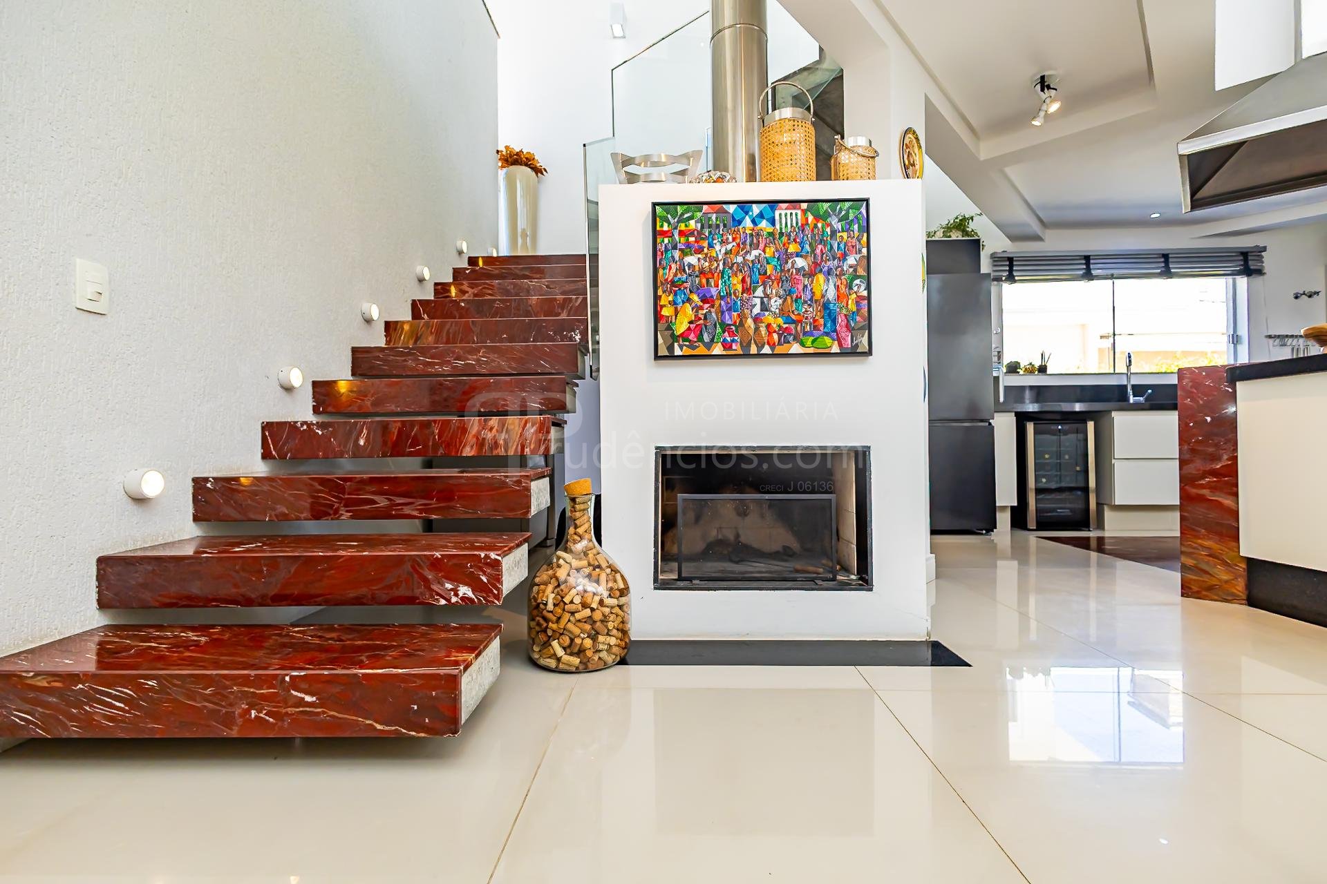 Logo na entrada, a casa recebe com uma charmosa cascata que conduz a uma sala imponente, com pé-direito duplo e abundância de luz natural.