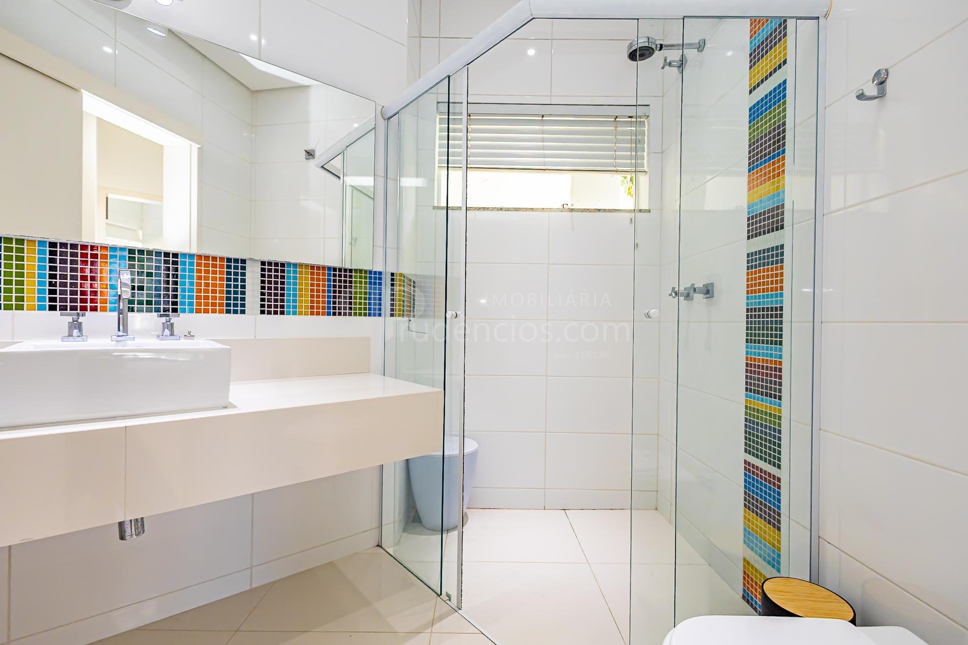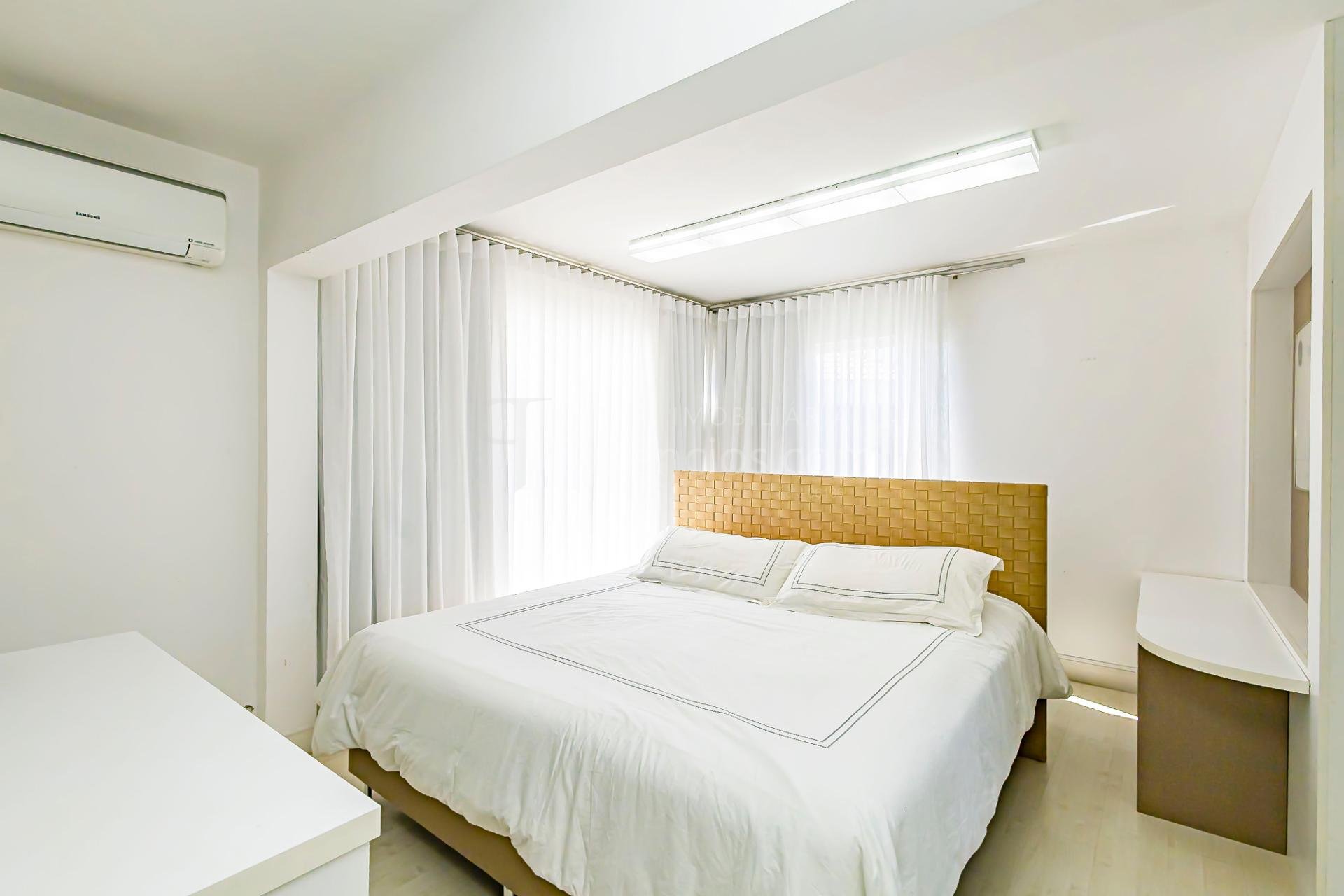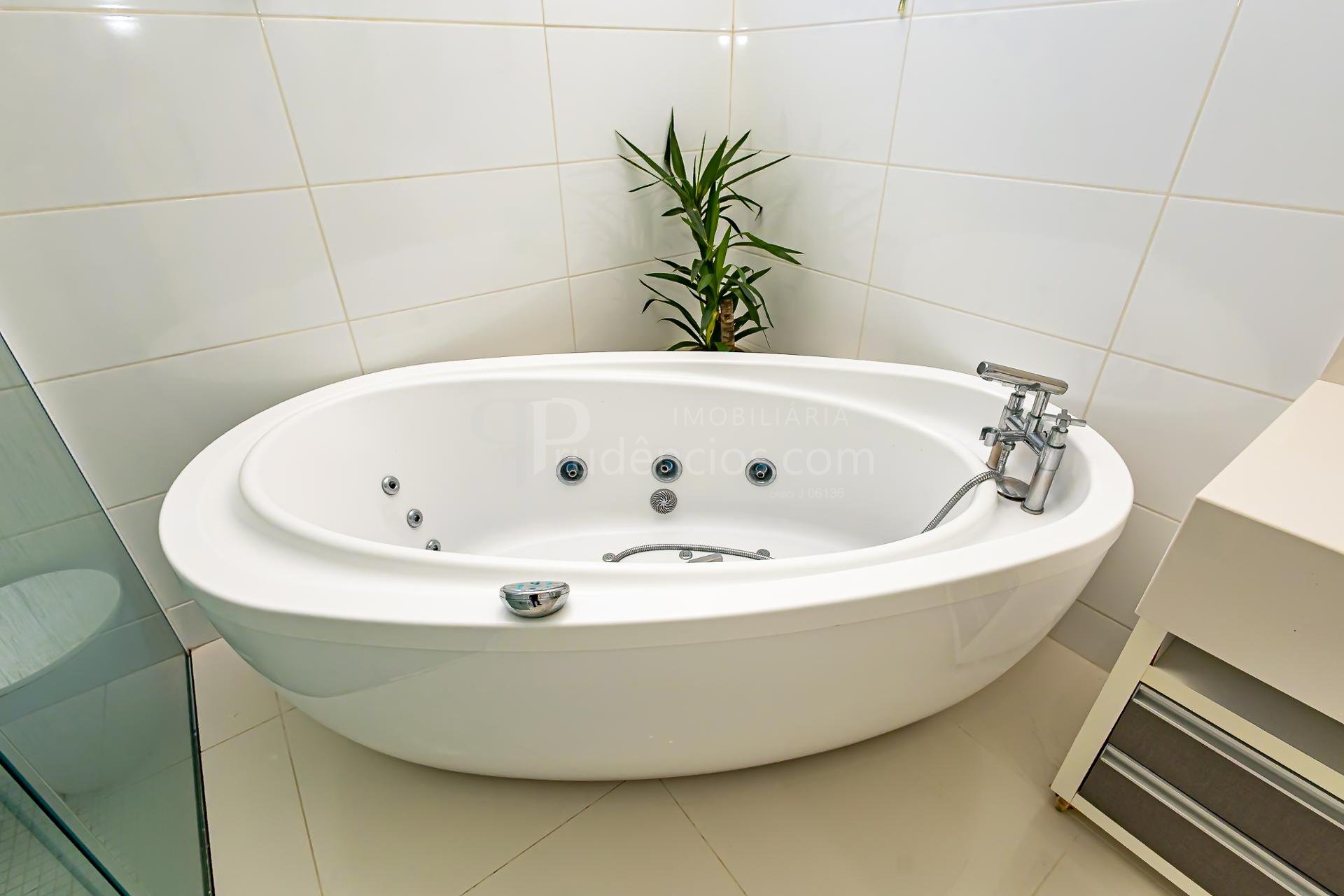 No pavimento superior também está a suíte master, que se destaca pelos dois closets independentes senhor e senhora e por um banheiro amplo, muito bem iluminado, com uma elegante banheira de imersão.
