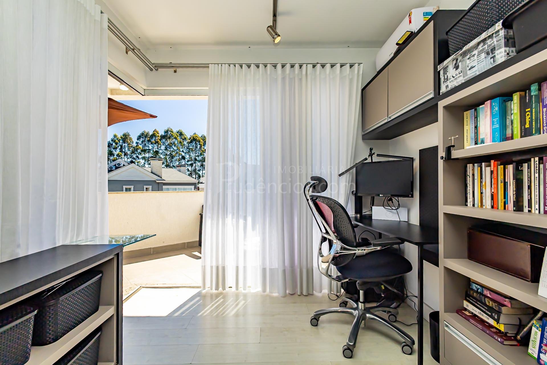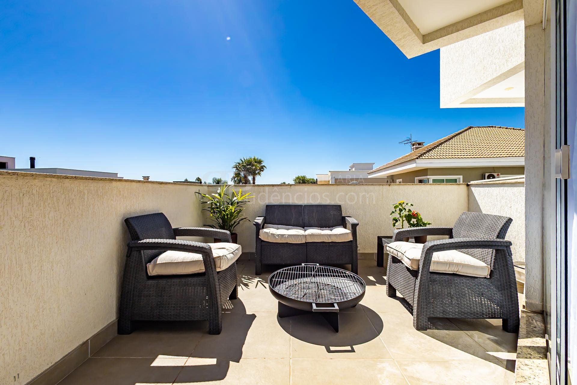 Subindo as escadas, surge um ambiente de convivência perfeito para reunir a família, equipado com televisão, área para jogos e um escritório com uma bela sacada, onde móveis externos convidam a aproveitar os dias de sol.