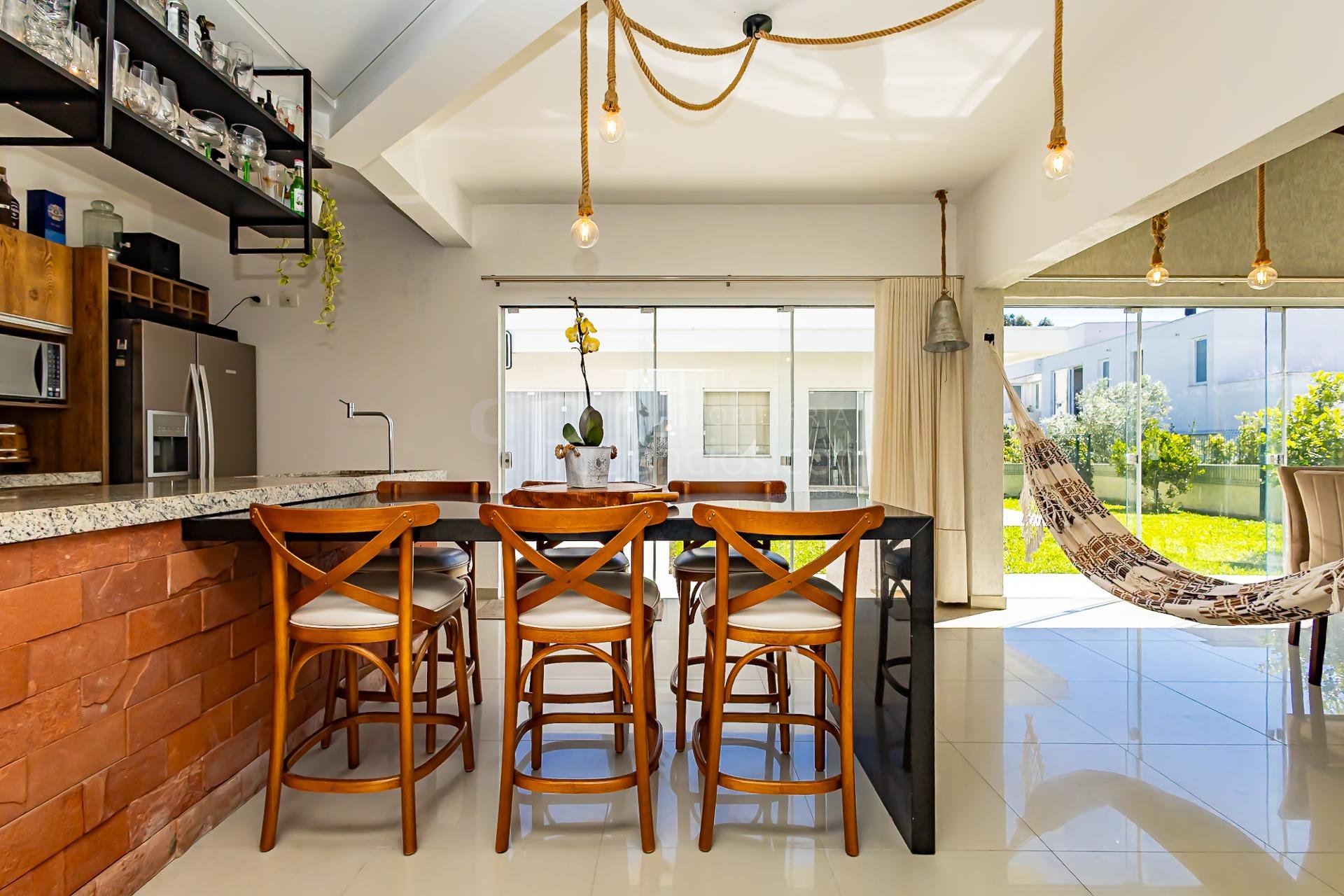 A cozinha, totalmente planejada e integrada, se conecta de forma harmoniosa à sala de jantar e à área gourmet com churrasqueira a carvão, um espaço que se integra de maneira independente tanto à sala quanto ao quintal, criando diferentes possibilidades de convívio.