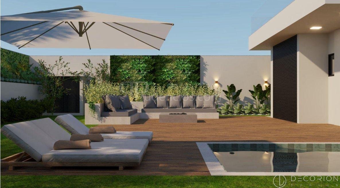Piscina ensolarada com deck, com fundos voltados para o sol durante todo o dia.
