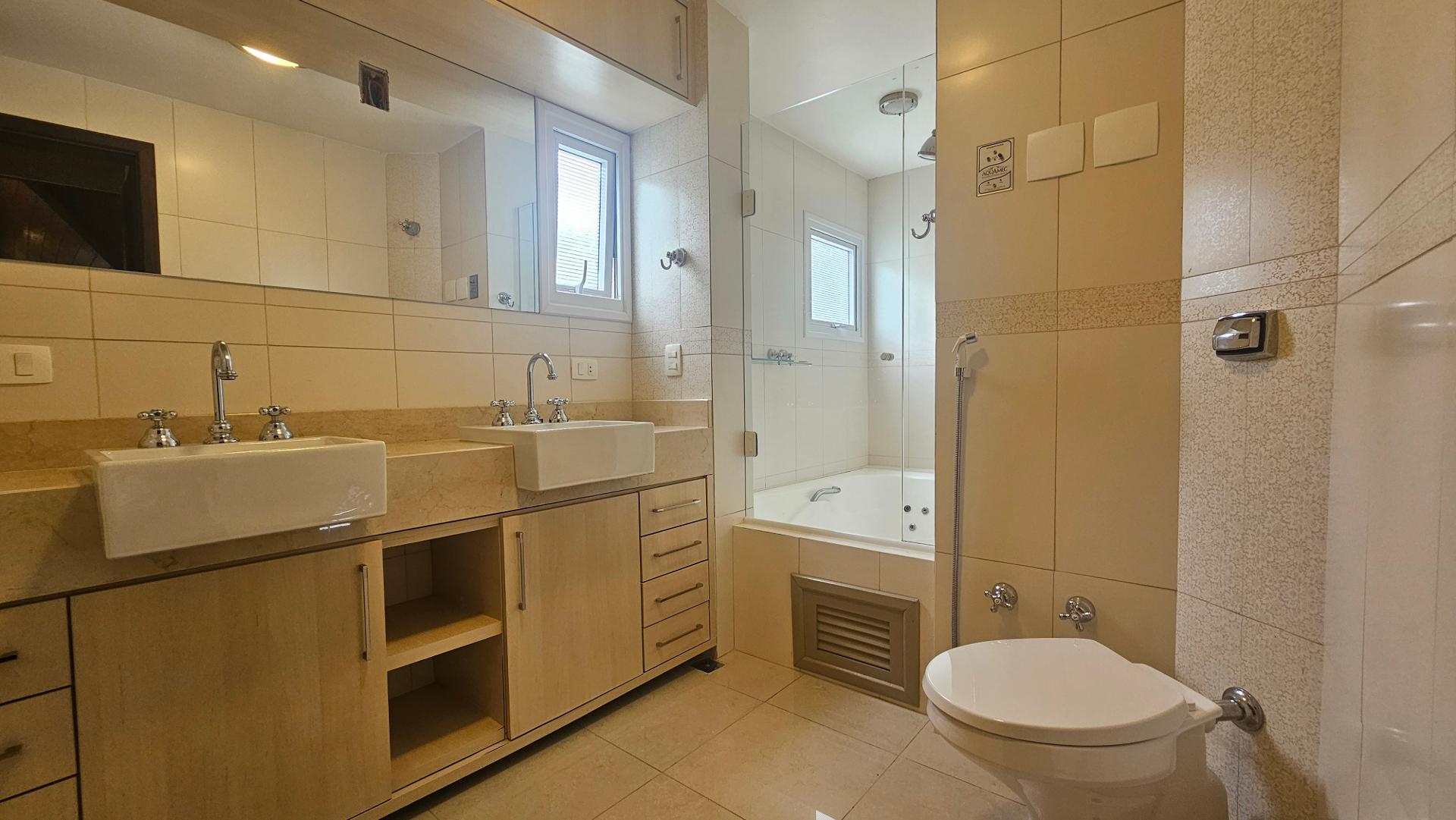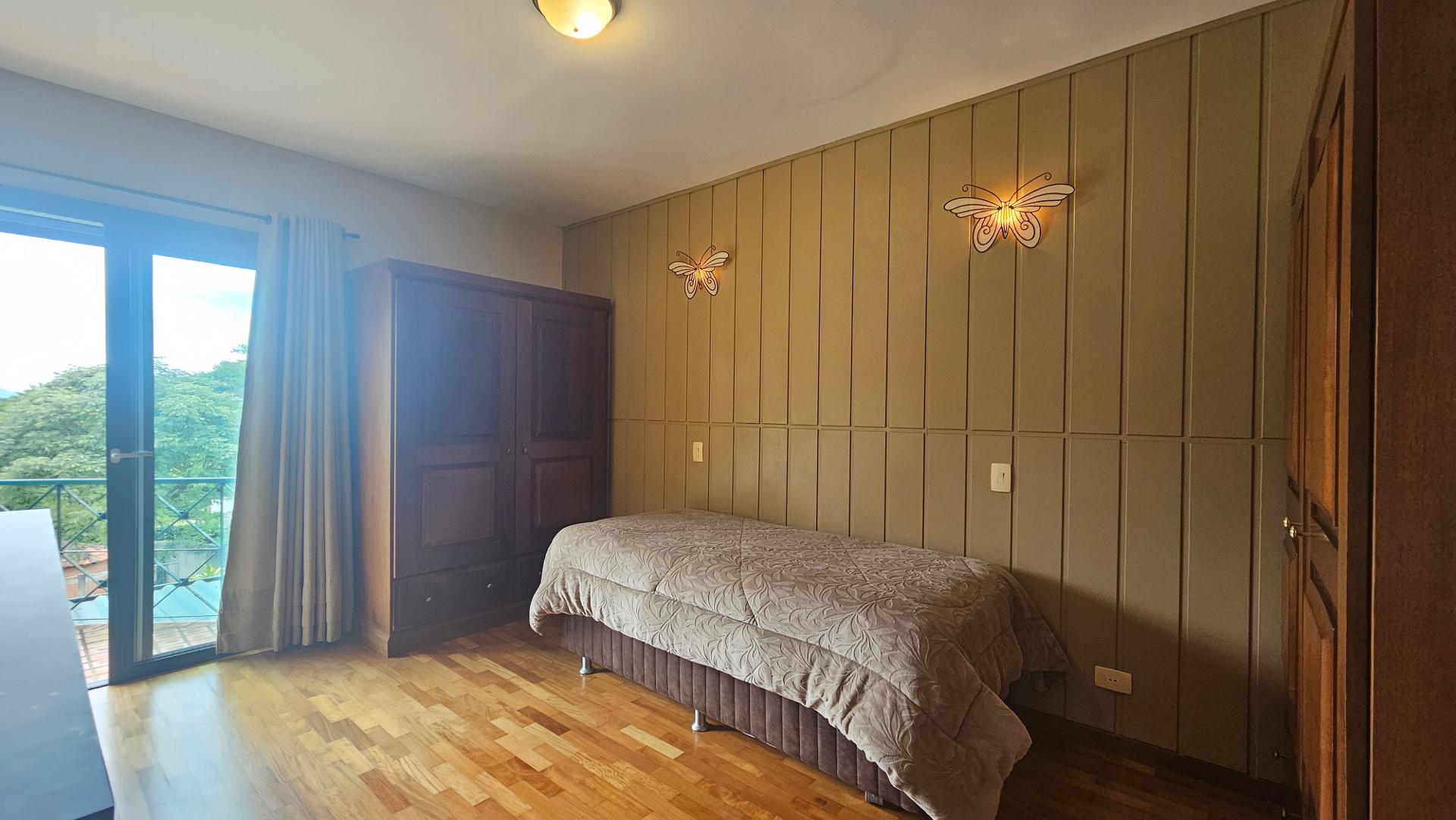 A casa tem 3 quartos, sendo 1 suíte no último andar, com closet espaçoso e banheiro com hidromassagem, com uma vista espetacular da Serra do Mar (veja o vídeo).