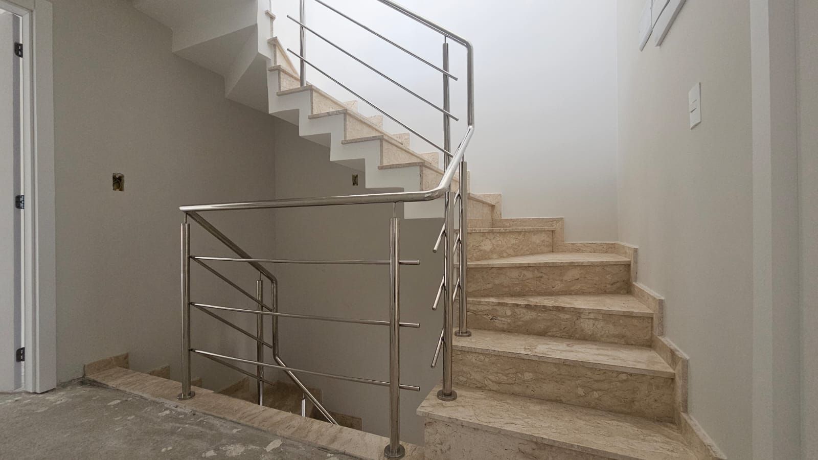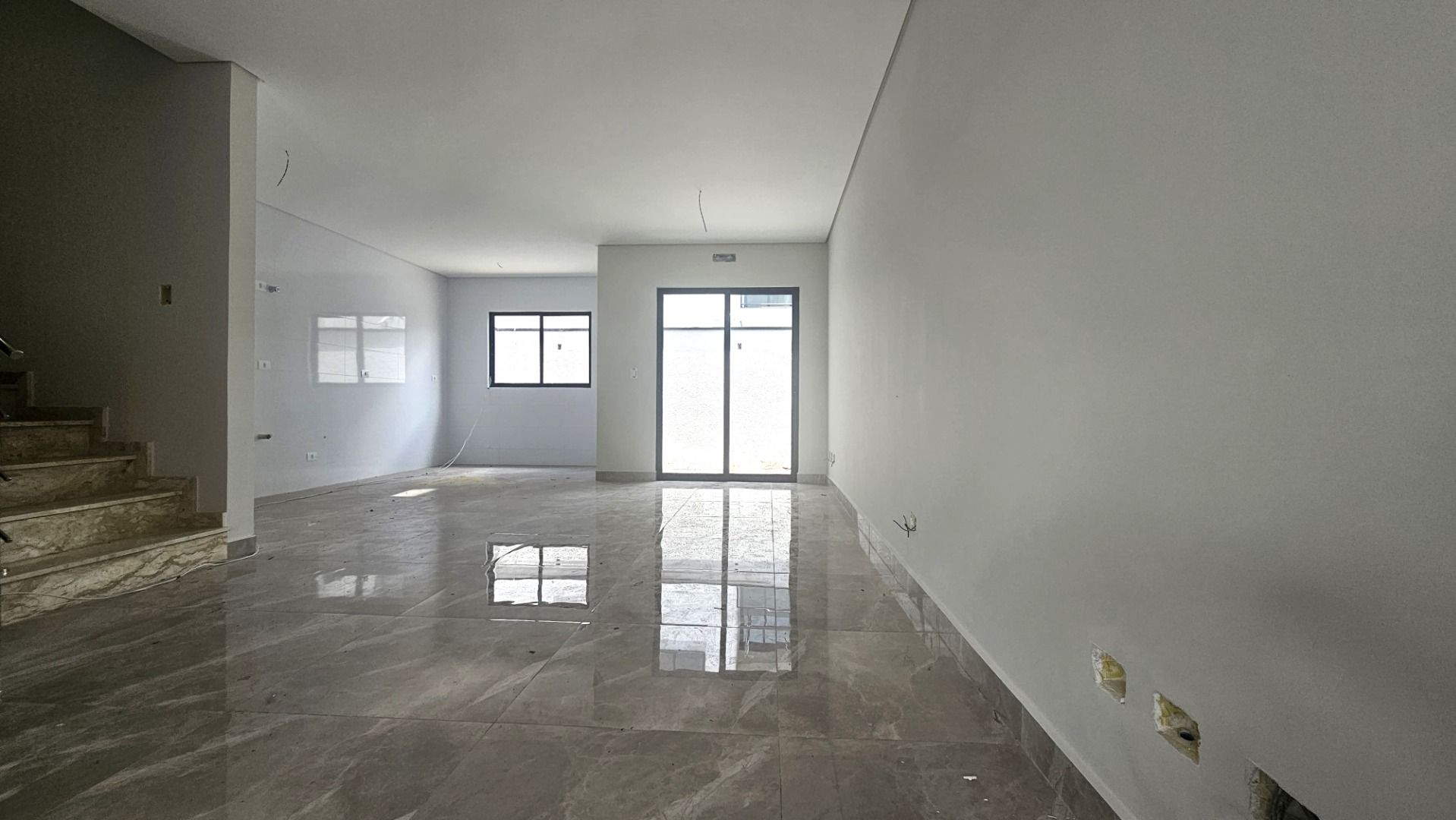 Piso térreo: ampla sala e cozinha em conceito aberto, lavabo, área de serviço e garagem.