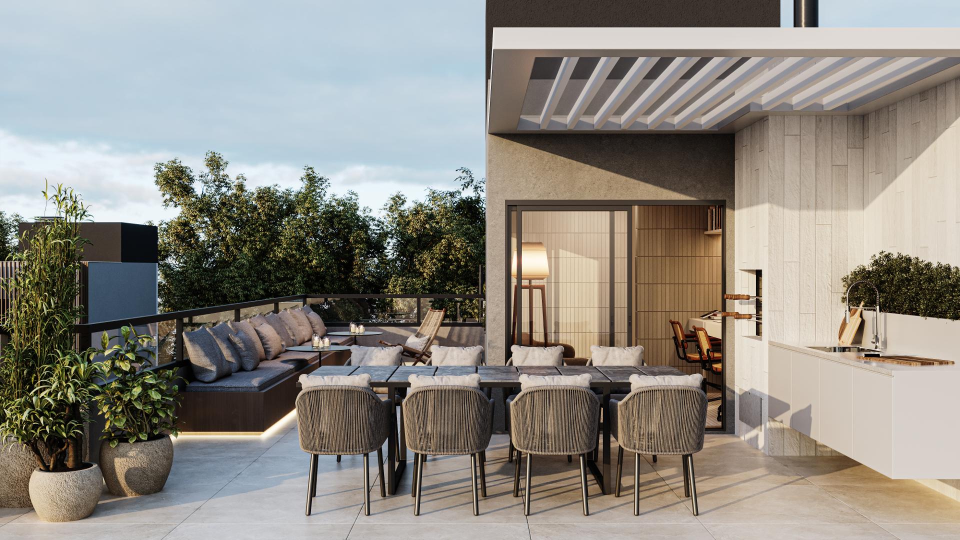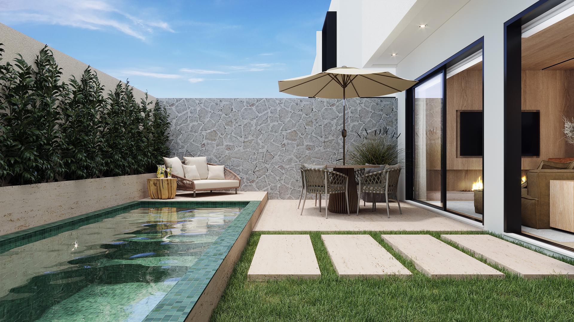 As casas possuem um amplo quintal com infraestrutura para instalação de piscina e um ático espaçoso com terraço e churrasqueira. A infraestrutura inclui preparação para ar-condicionado e um sistema para reutilização de águas pluviais.
