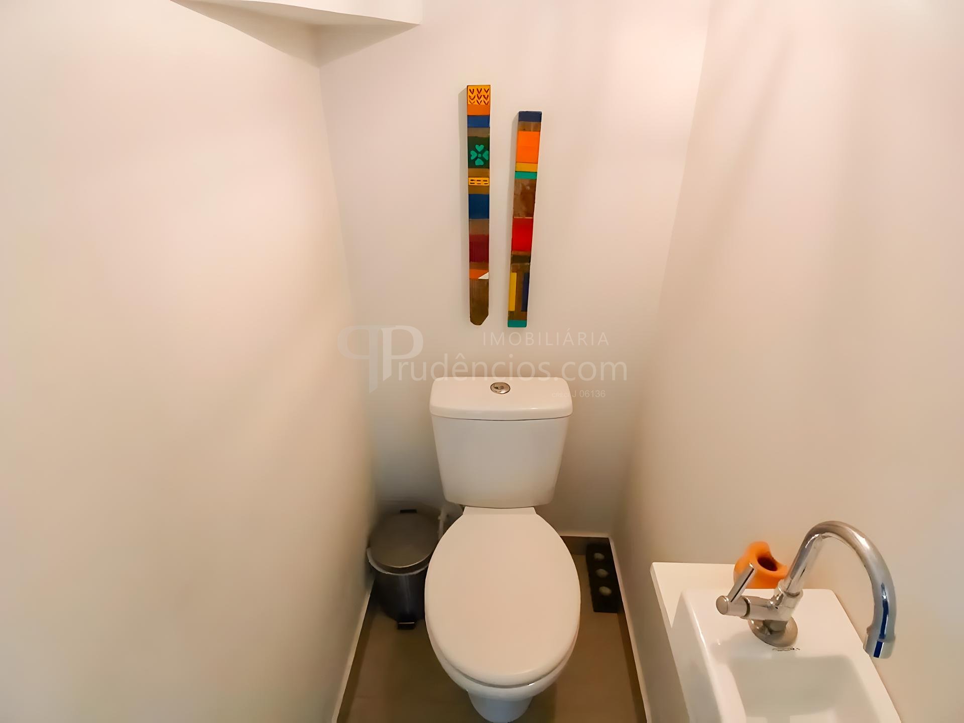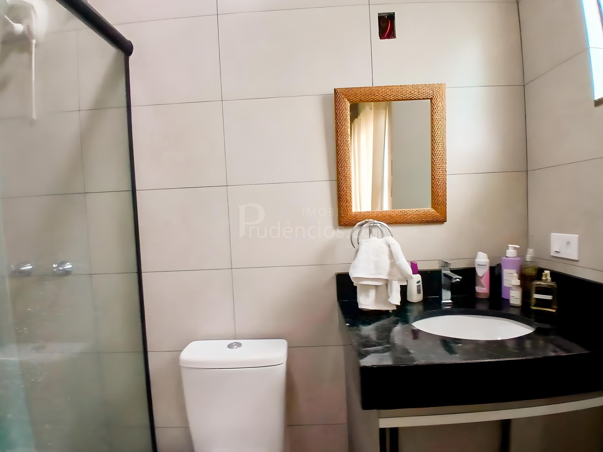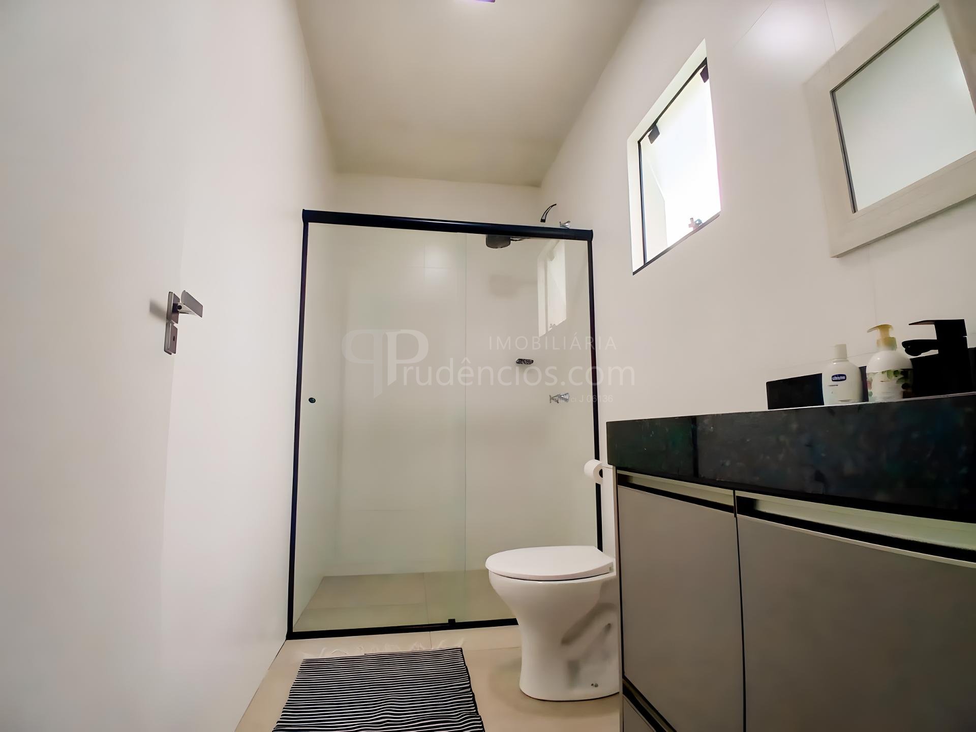 Banheiro social grande, também com armário e box.