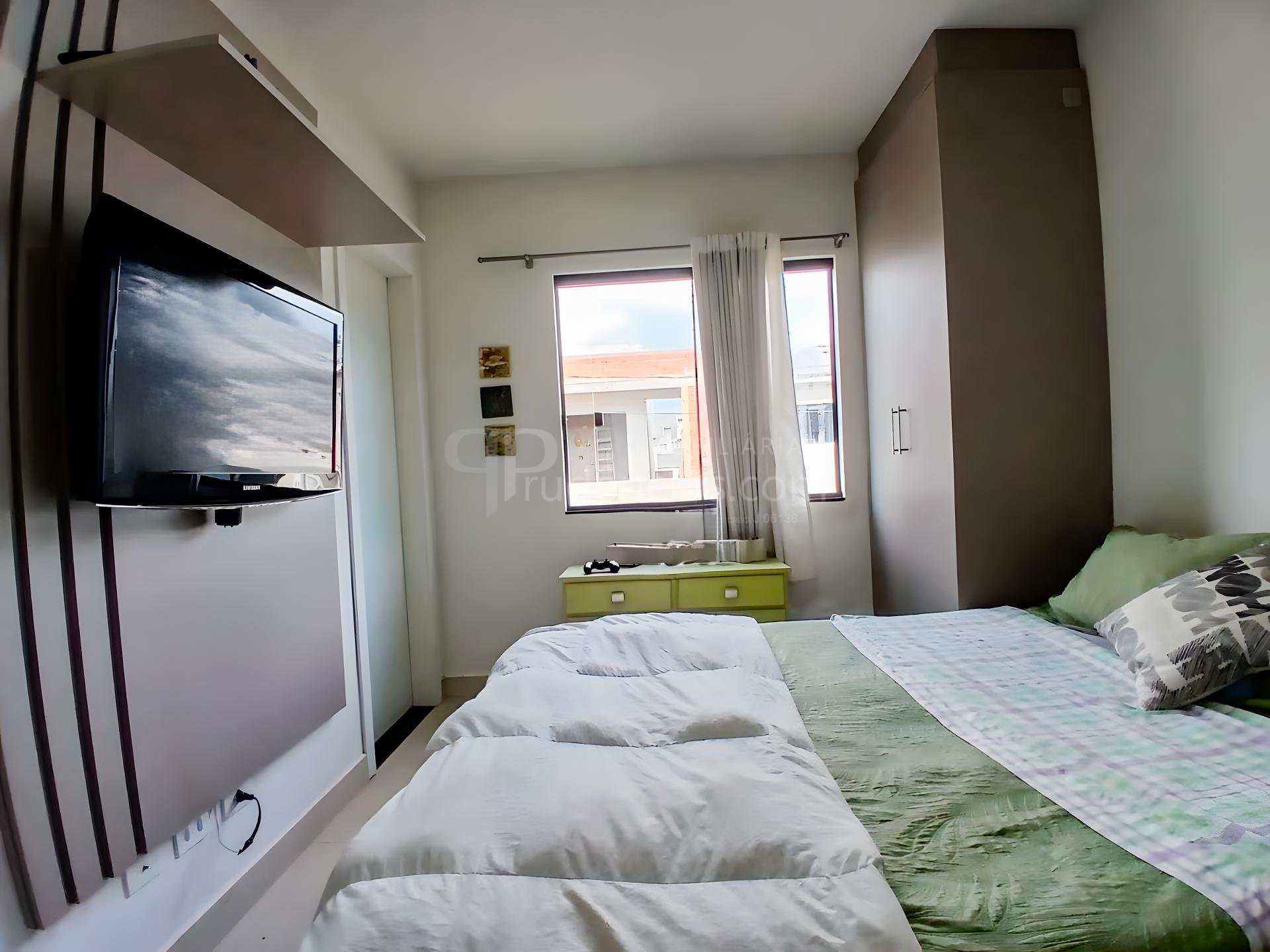 Suíte ampla com armários planejados e painel para TV.