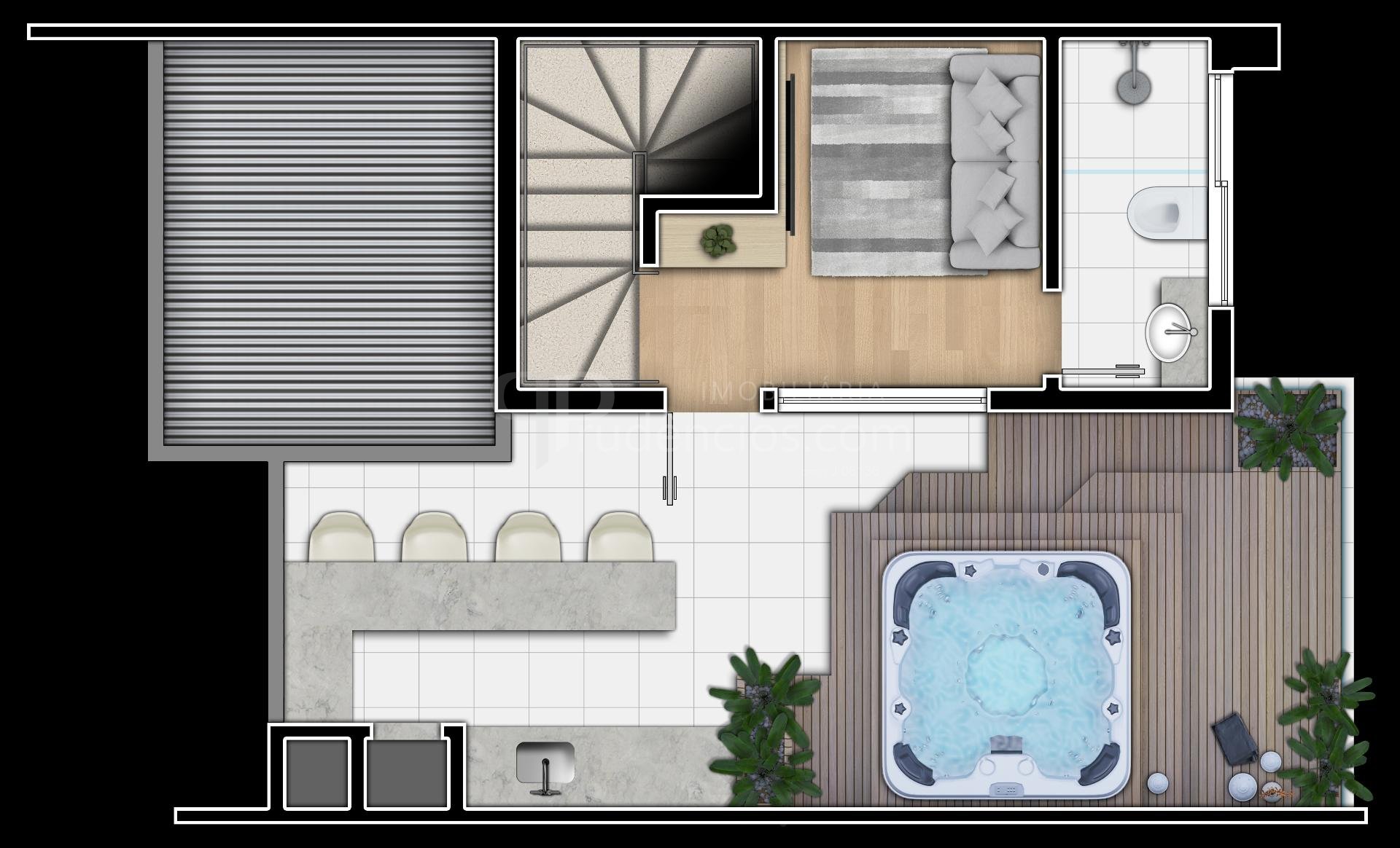 Terraço com espaço para home office, estar íntimo ou mais uma suíte com banheiro completo, espaçosa area descoberta com infra para jacuzzi e espaço gourmet.