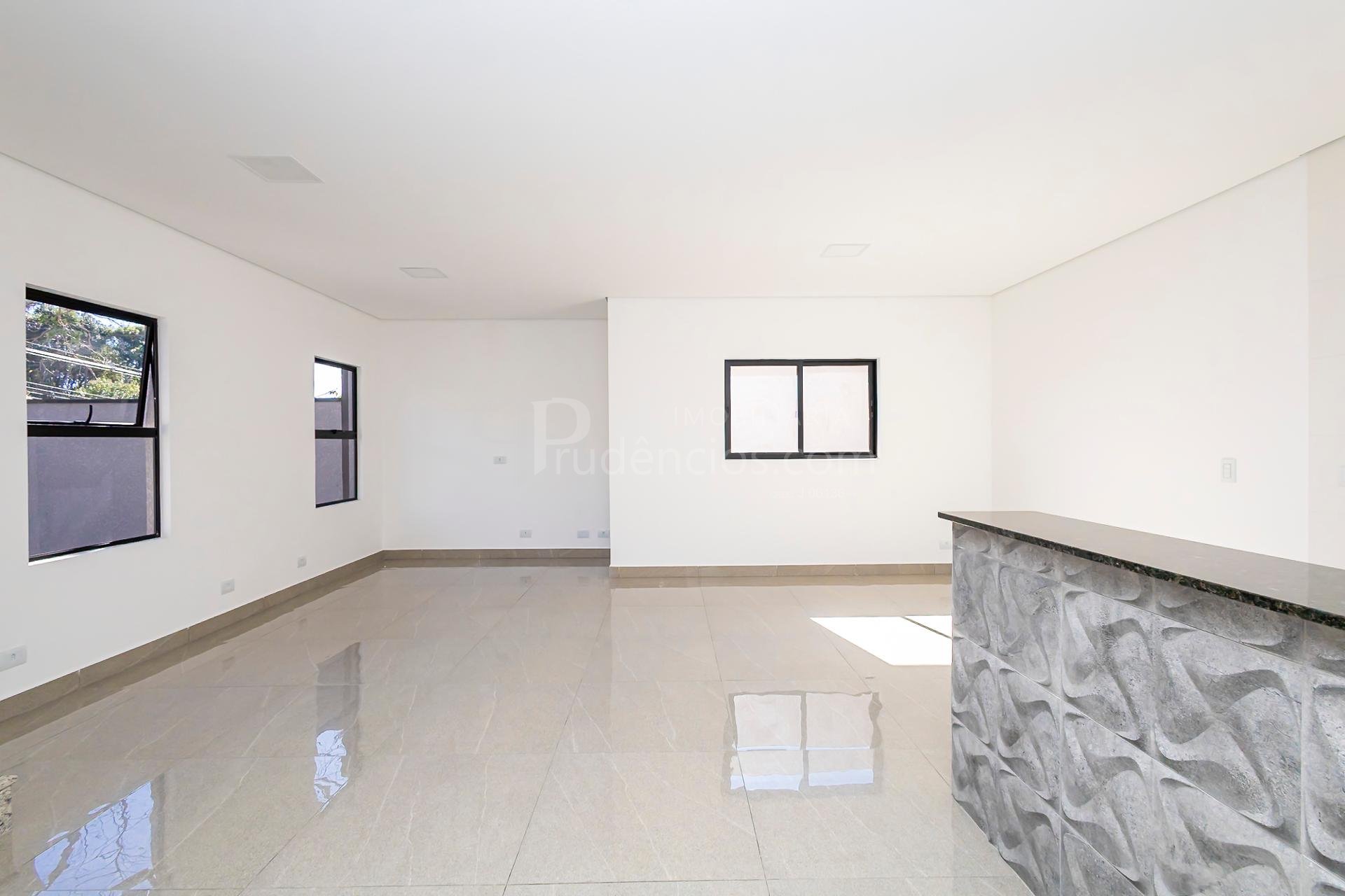 - Sala para dois ambientes integrada à cozinha com bancada