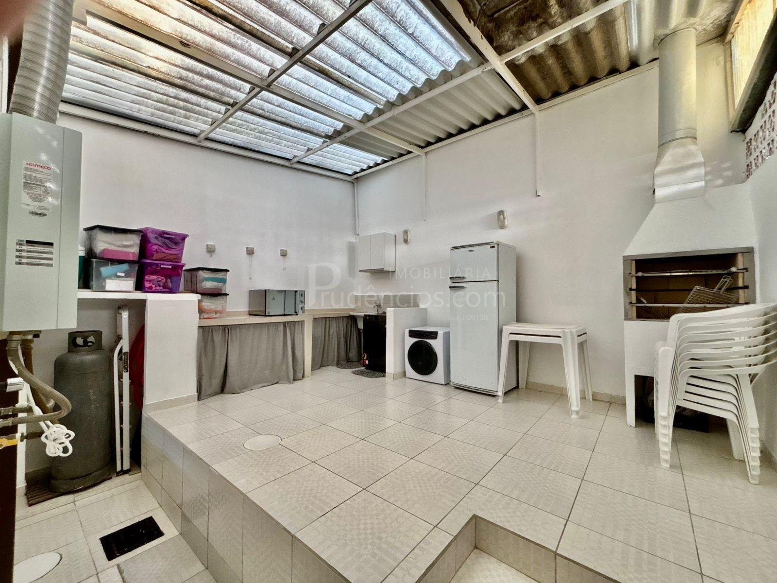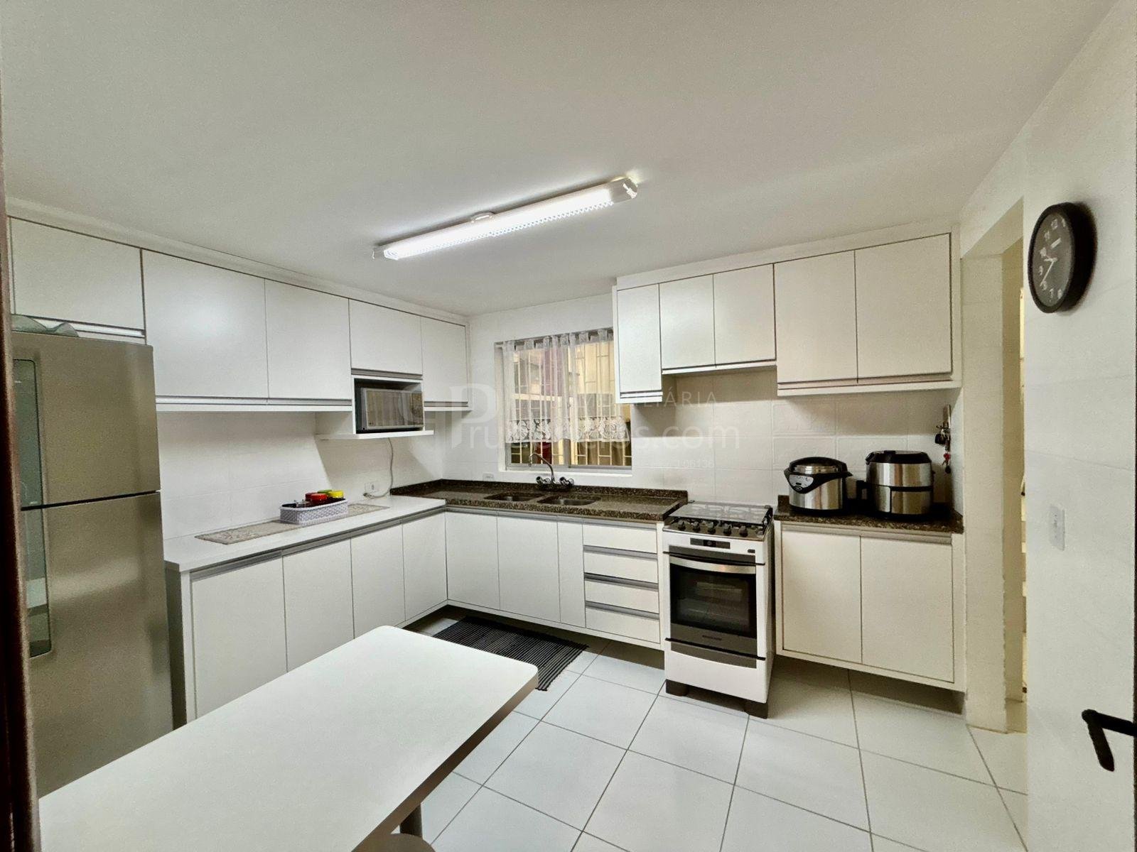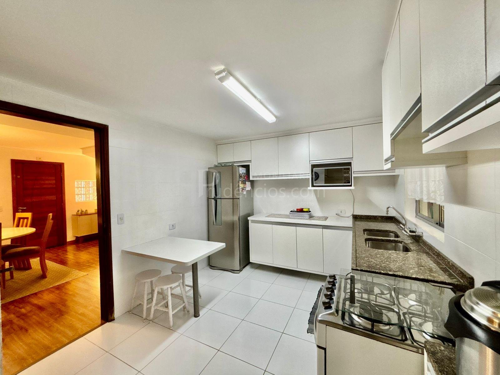 A cozinha também se destaca pelo bom tamanho, com móveis planejados de qualidade e espaço para mesa, tornando o ambiente funcional e acolhedor, além de contar com uma área ao lado para passagem e organização de roupas. O imóvel possui vaga de garagem para dois carros, com possibilidade para um terceiro.