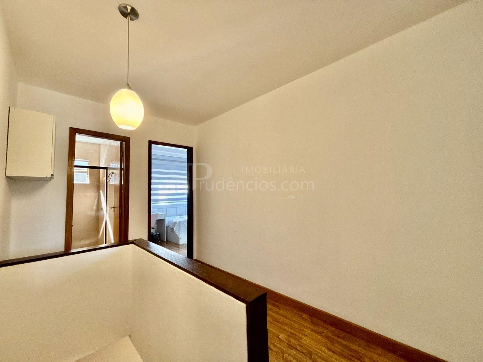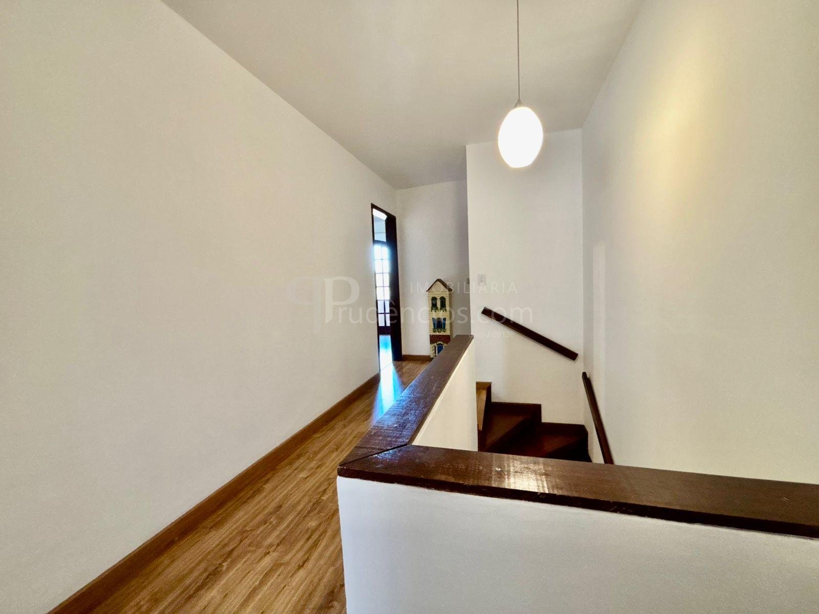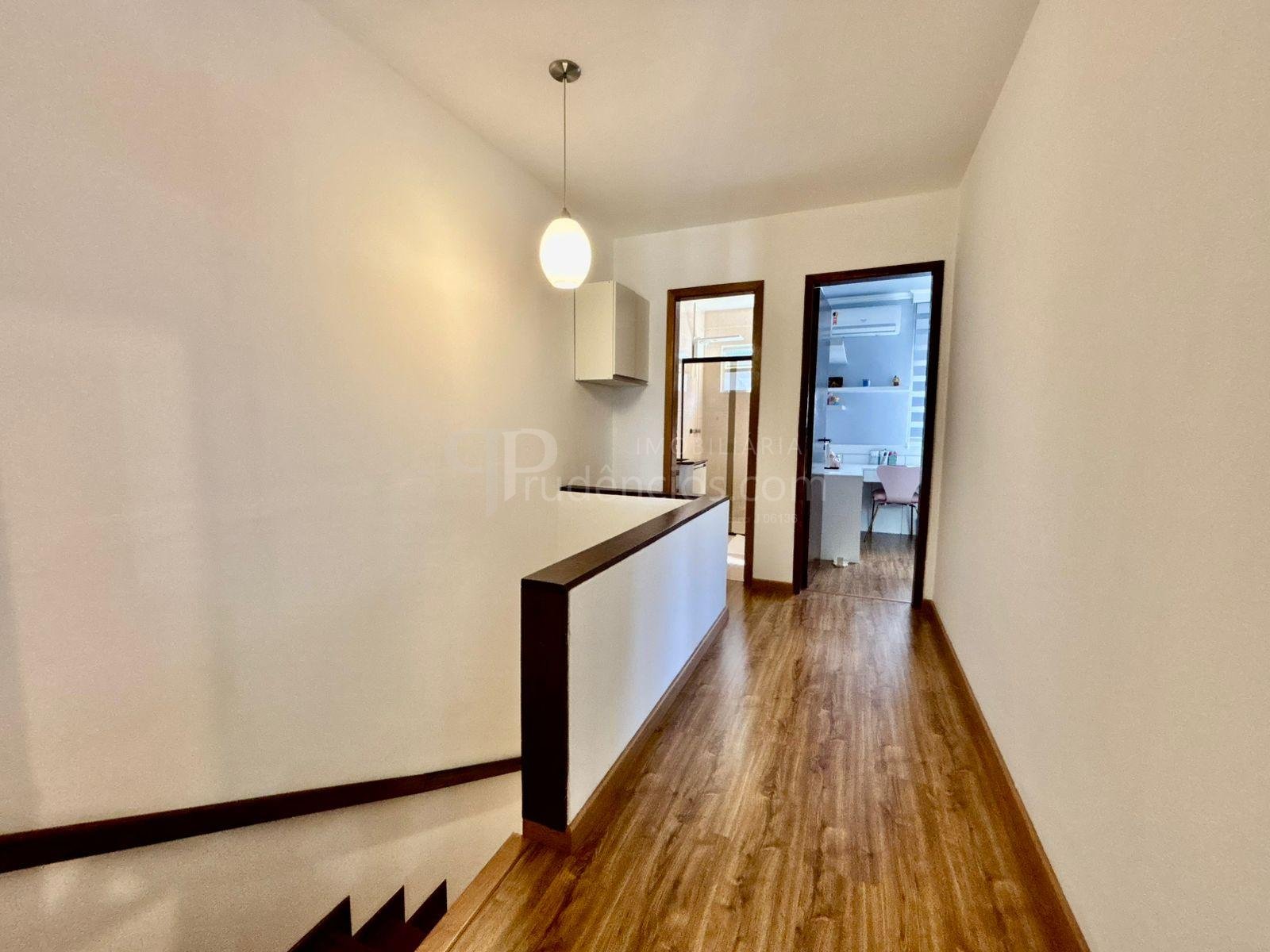 A escada é confortável e leva ao piso superior, onde há um corredor mais amplo que o padrão, trazendo sensação de espaço.