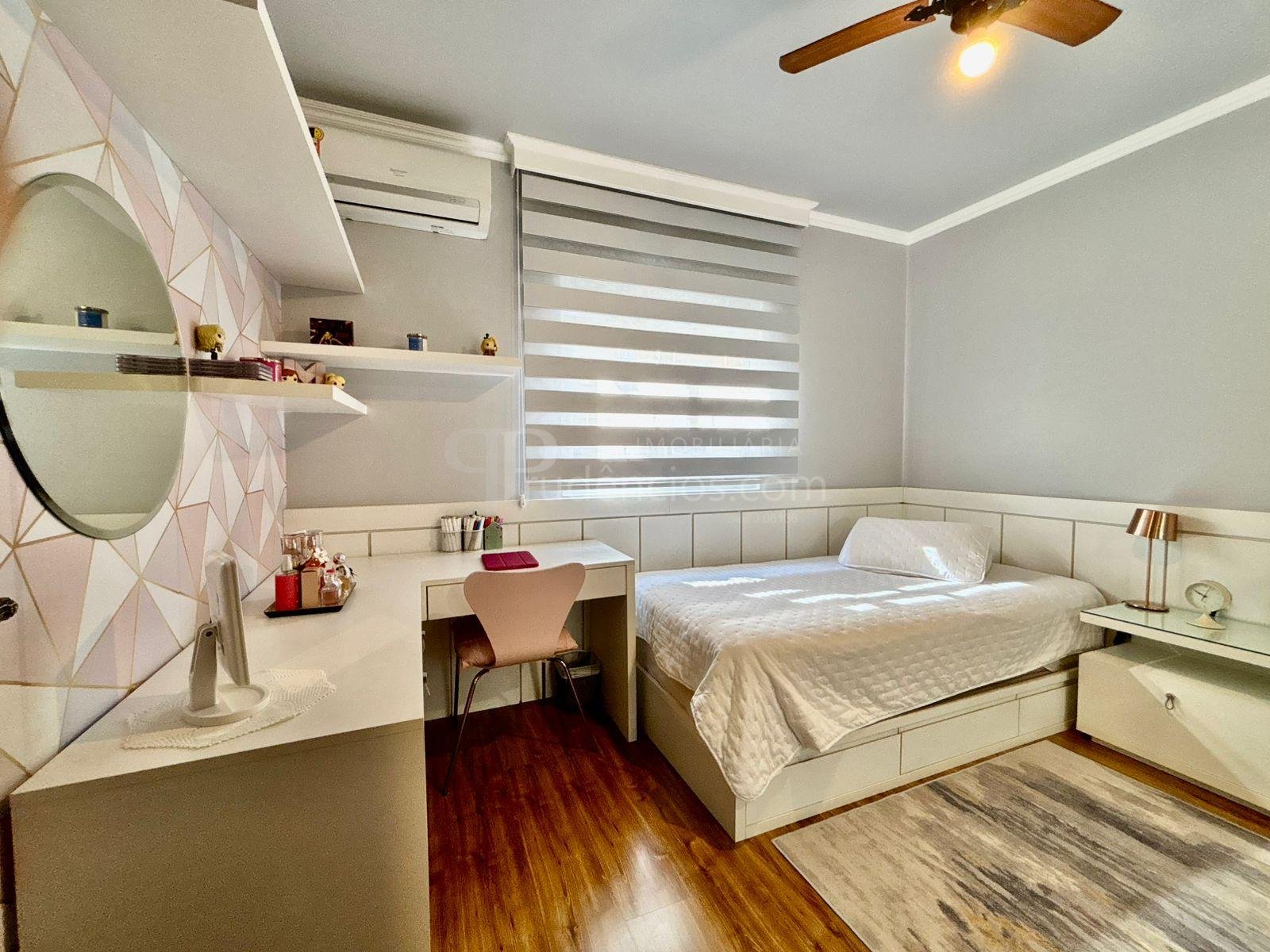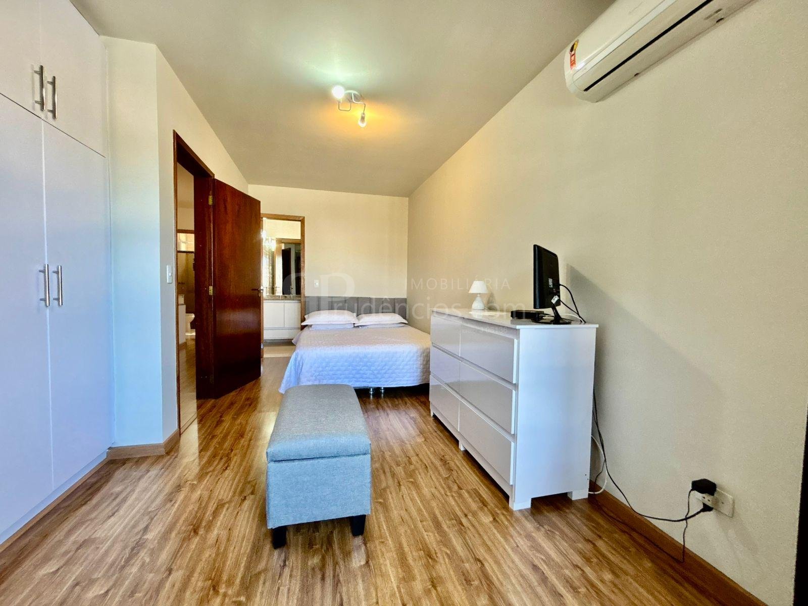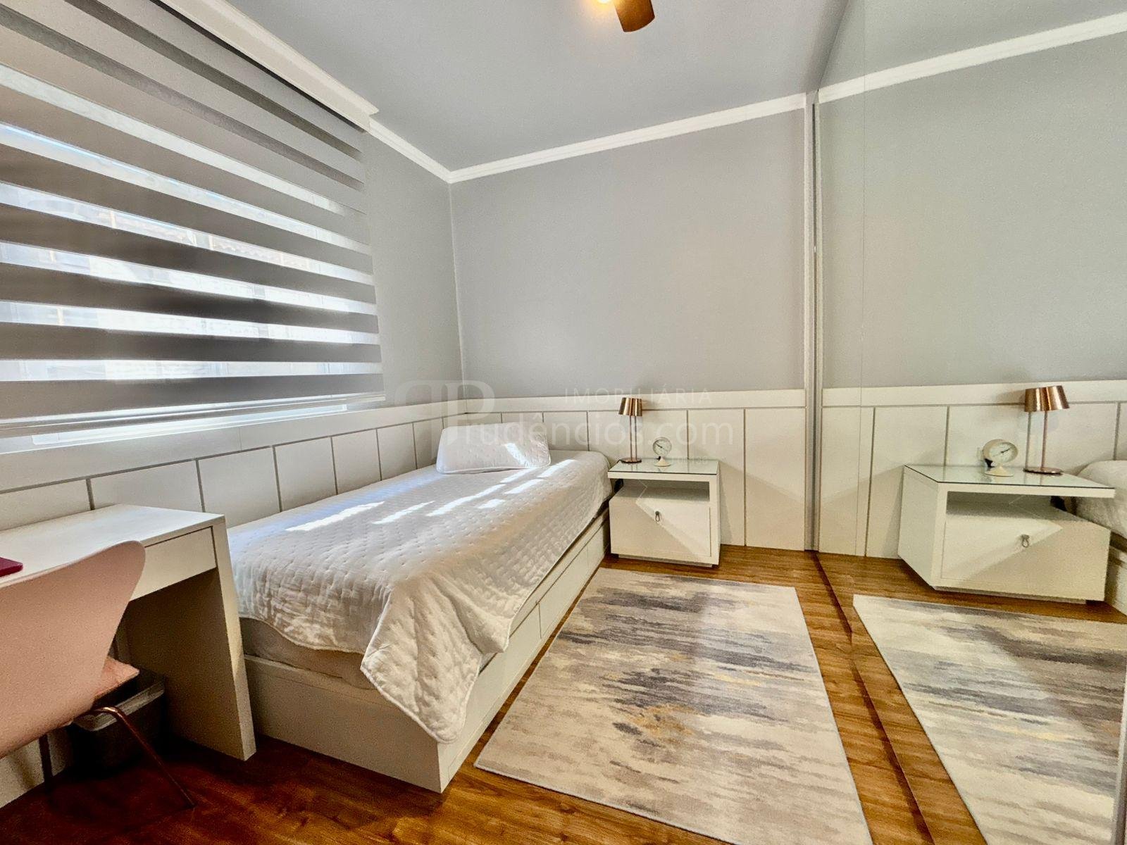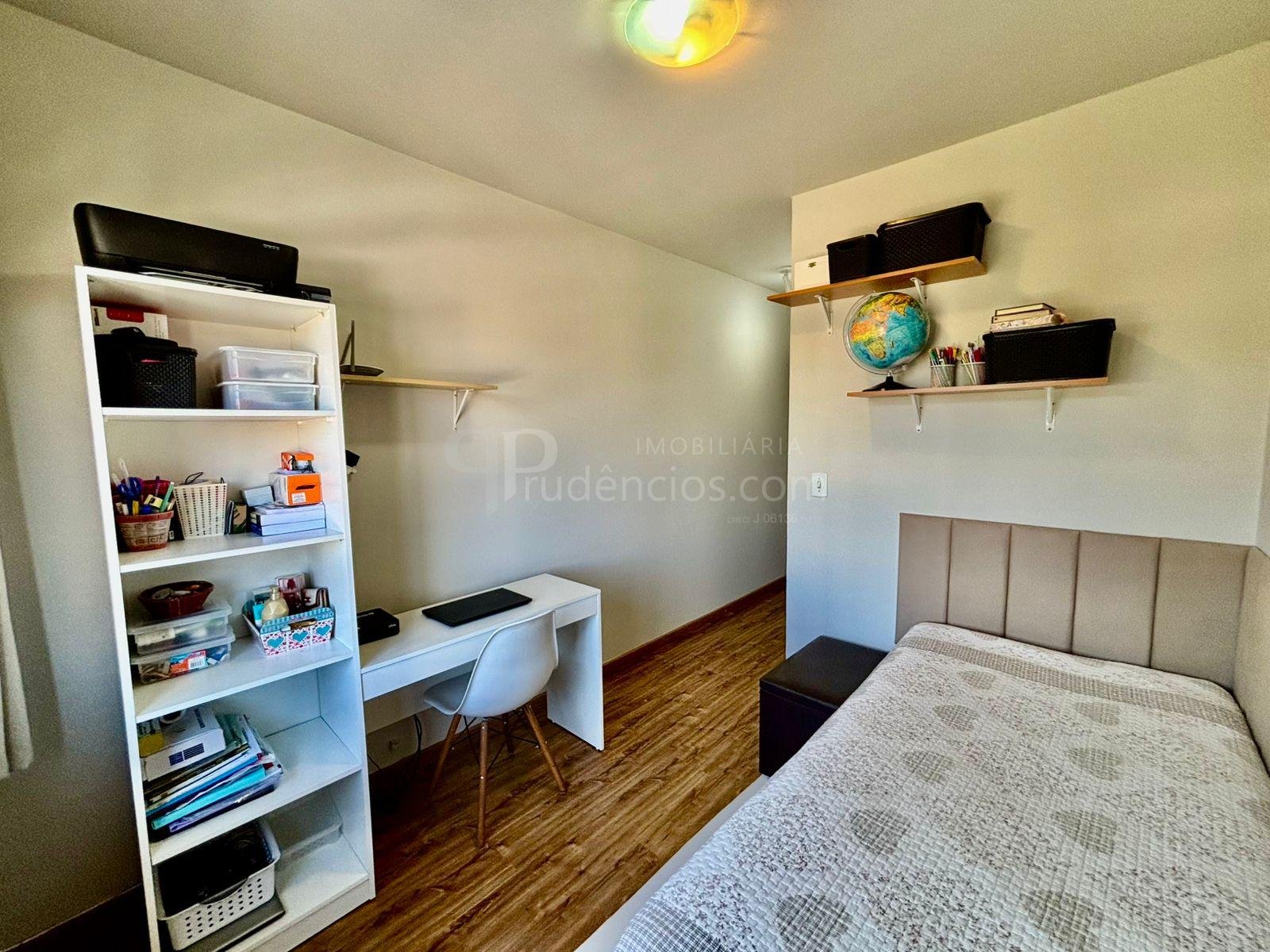 São três dormitórios bem distribuídos: um quarto juvenil totalmente mobiliado, com cama e ar-condicionado, um quarto adulto com guarda-roupas em toda a extensão da parede e espaço para cama e área de trabalho, além de uma suíte espaçosa, com closet e sacada com uma bela vista.