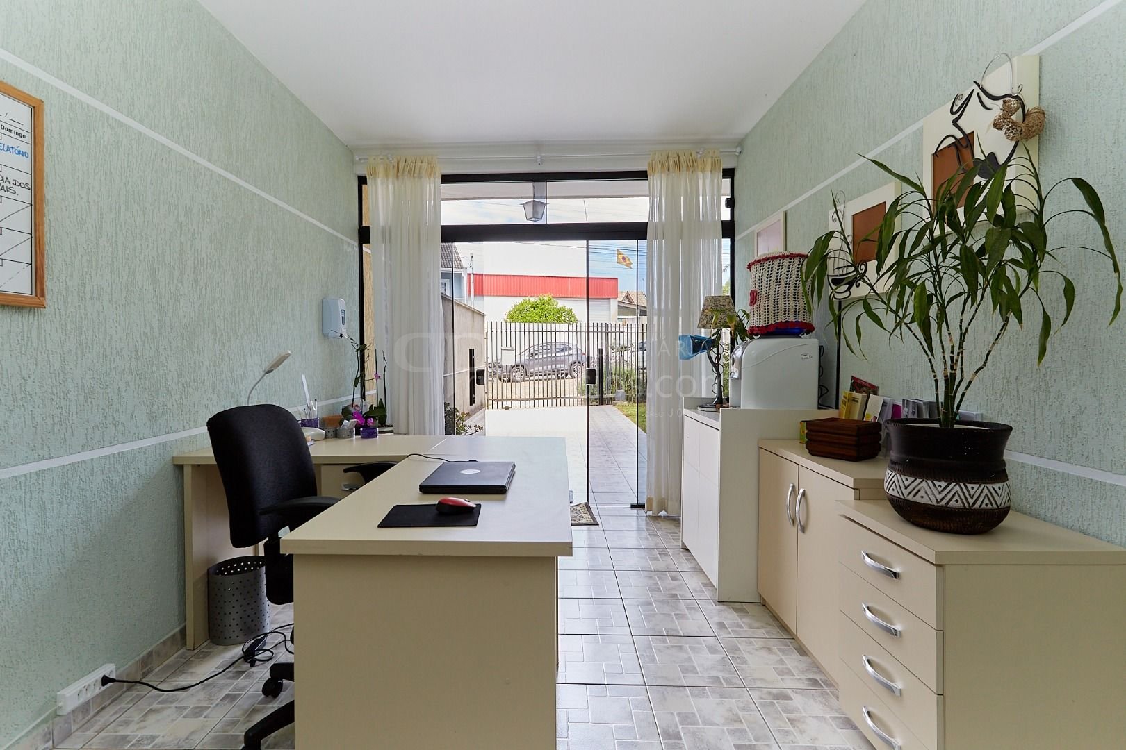 Sala ampla para 2 ambientes. Parte da garagem foi revertida em escritório, mas pode ser revertida novamente para vaga coberta.